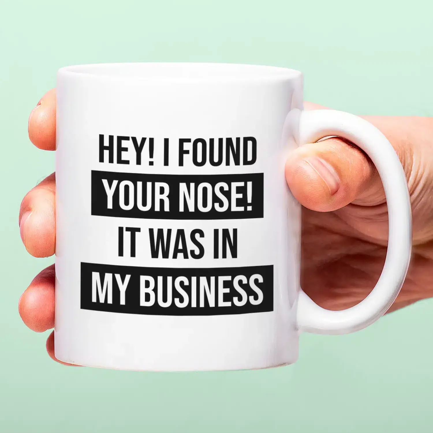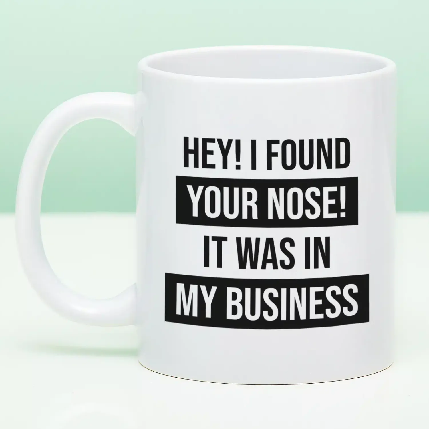 Heb je een bemoeizuchtige collega die altijd allerlei persoonlijke vragen stelt? Misschien wordt dat minder als je de Mok I Found Your Nose In My Business gebruikt. Op deze mok staat de tekst: Hey! I found your nose! It was in my business. Ook leuk als niet zo subtiel cadeautje voor tantes en anderen die zich echt teveel met jouw leven bemoeien.