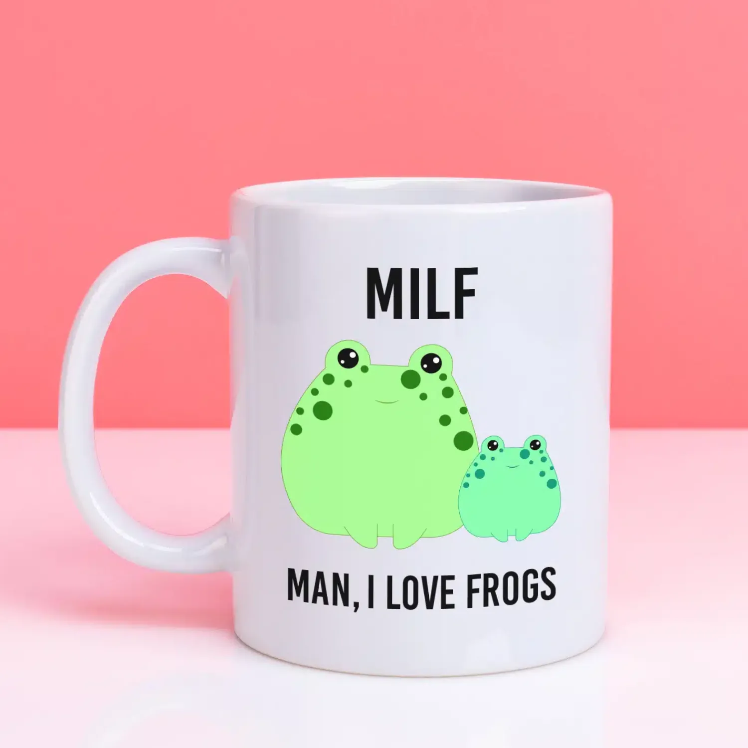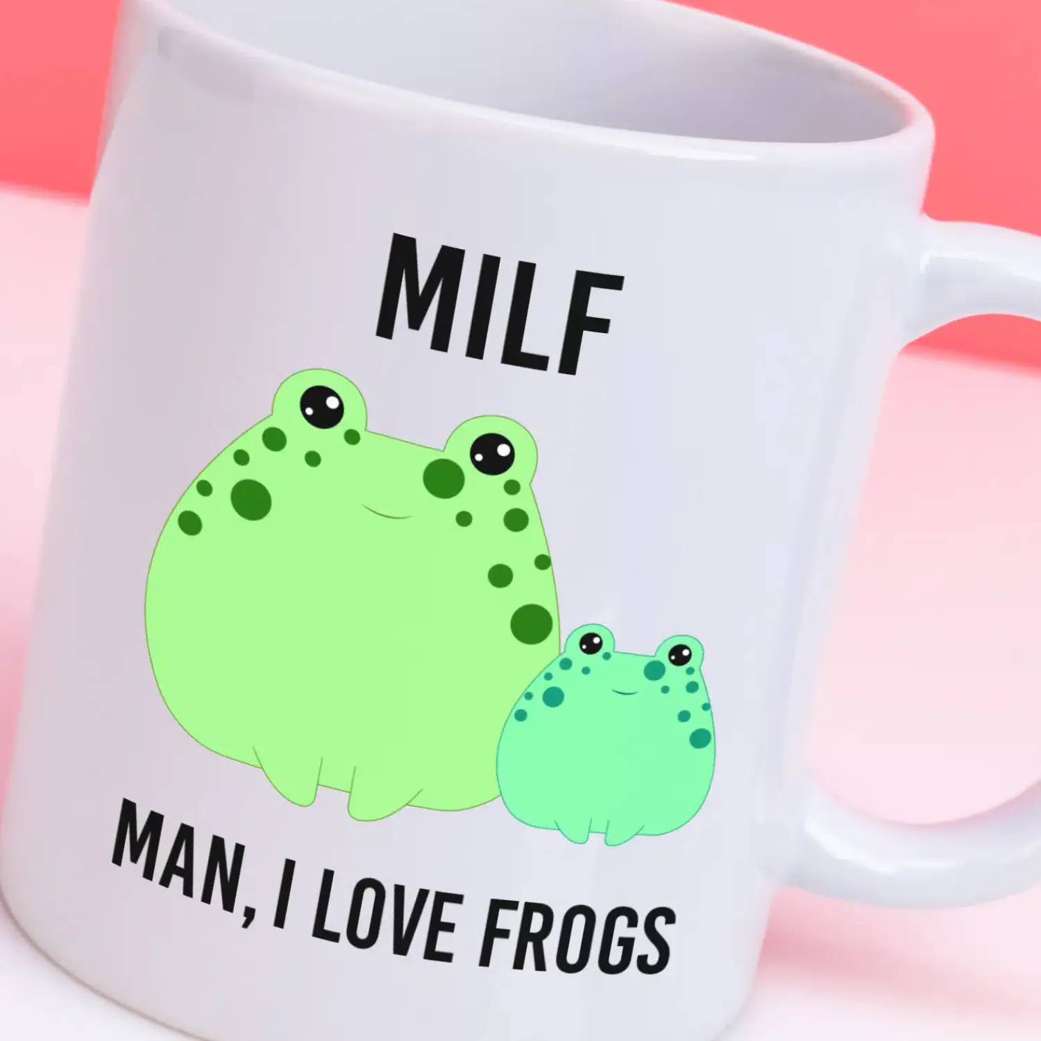 Geef het maar toe, toen je het woord MILF zag, dacht je niet aan kikkers. Maar dat is precies de grap van deze beker. Op de beker staan twee kikkers en de tekst: MILF: Man, I Love Frogs.