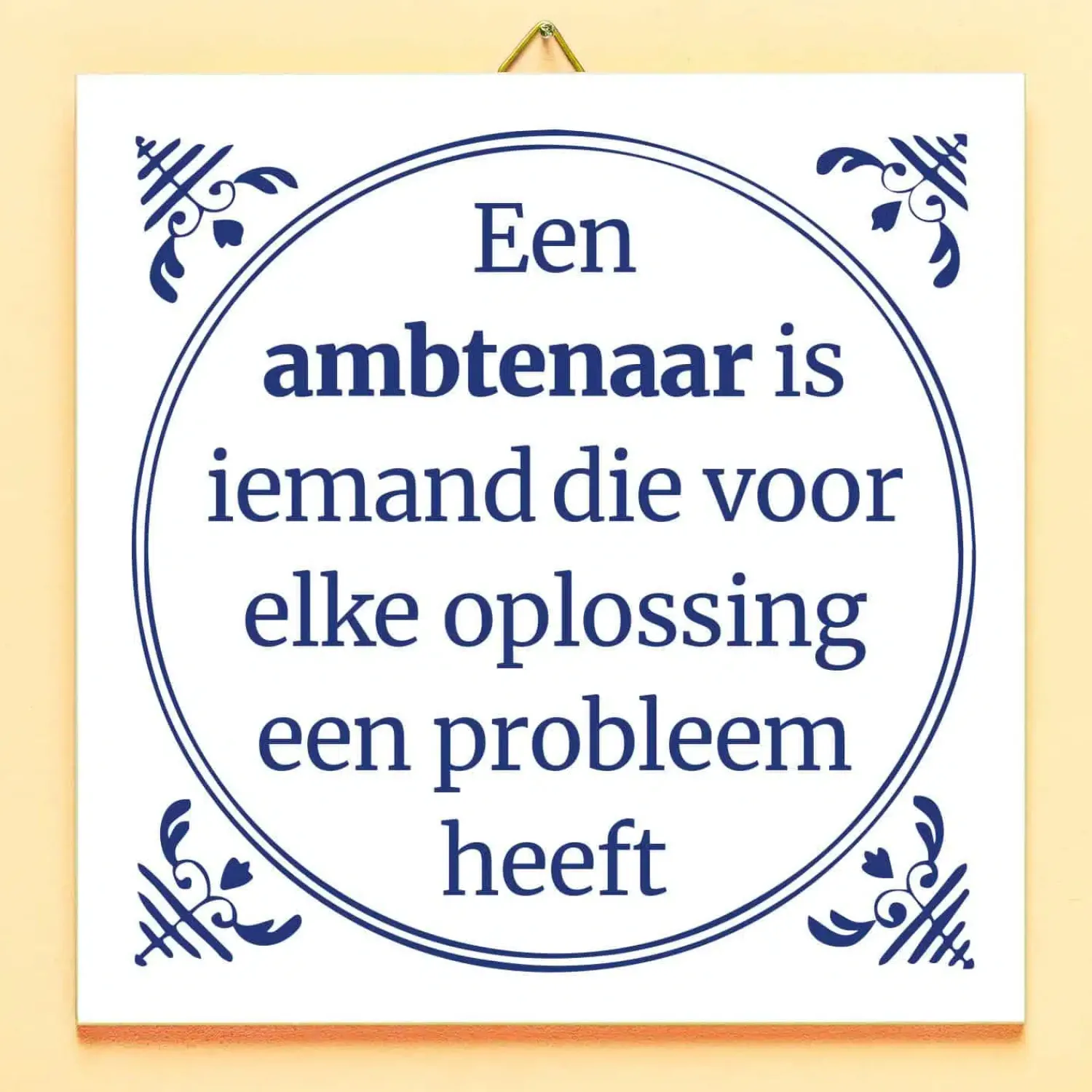 Stiekem zijn we allemaal stikjaloers op de werktijden en vakantiedagen van ambtenaren, maar we maken er maar wat graag grapjes over. Het Tegeltje Een ambtenaar is iemand is een grappig cadeau voor een vriend of familielid die ambtenaar is. Op het op Delfts blauw geïnspireerde tegeltje staat de tekst: Een ambtenaar is iemand die voor elke oplossing een probleem heeft. Want waarom zou je makkelijk doen, als het ook moeilijk kan? Leuk voor in het gemeentehuis.