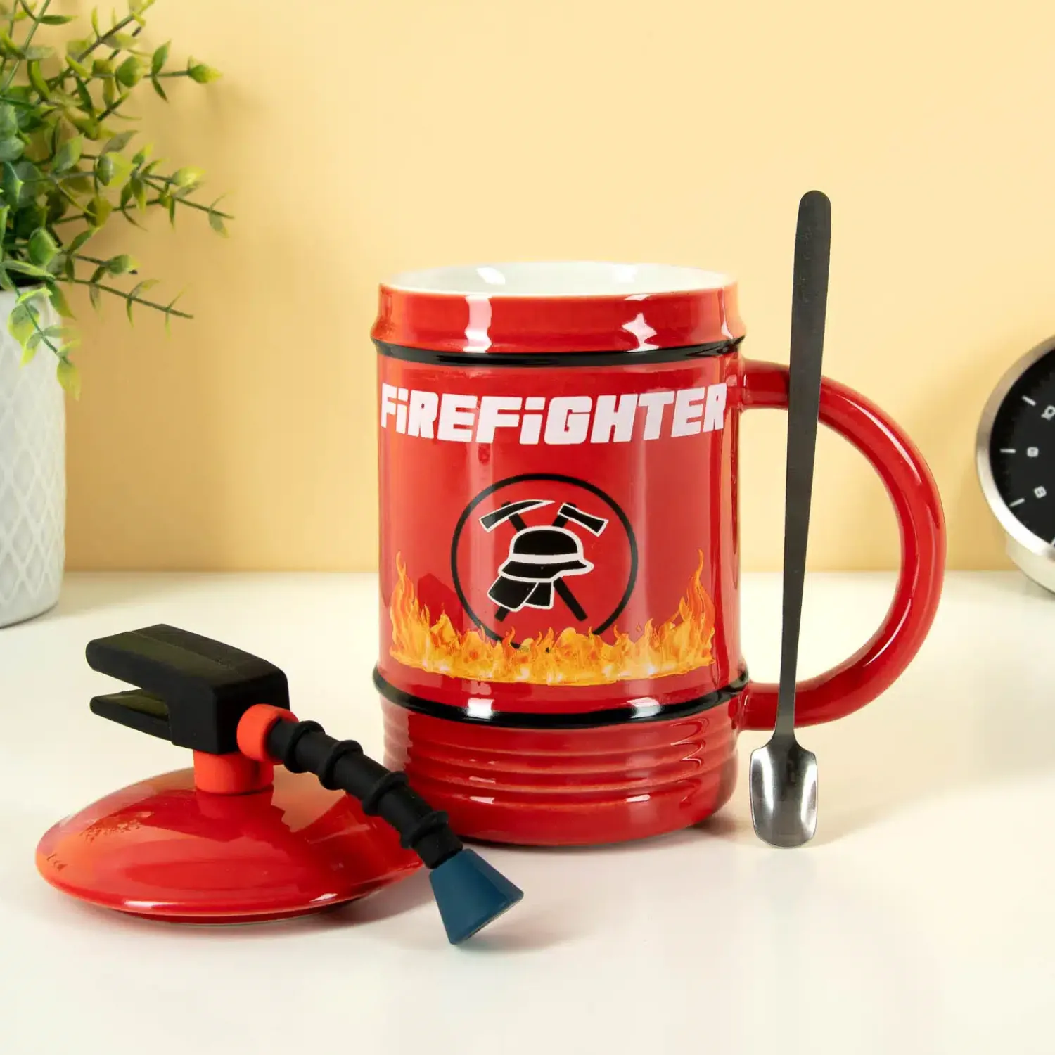 Als je bijna omkomt van de dorst, dan is er maar één oplossing: de Brandblusser mok gebruiken om je dorst te lessen. Deze unieke beker ziet eruit als een brandblusser: compleet met spuit op het deksel. Het is de perfecte mok voor fans van Chicago Fire, die graag een beker warme chocomel met slagroom willen leeglepelen. Of geef de beker aan één van de helden van je lokale (vrijwillige) brandweer of aan iemand die graag uit humoristische mokken drinkt.