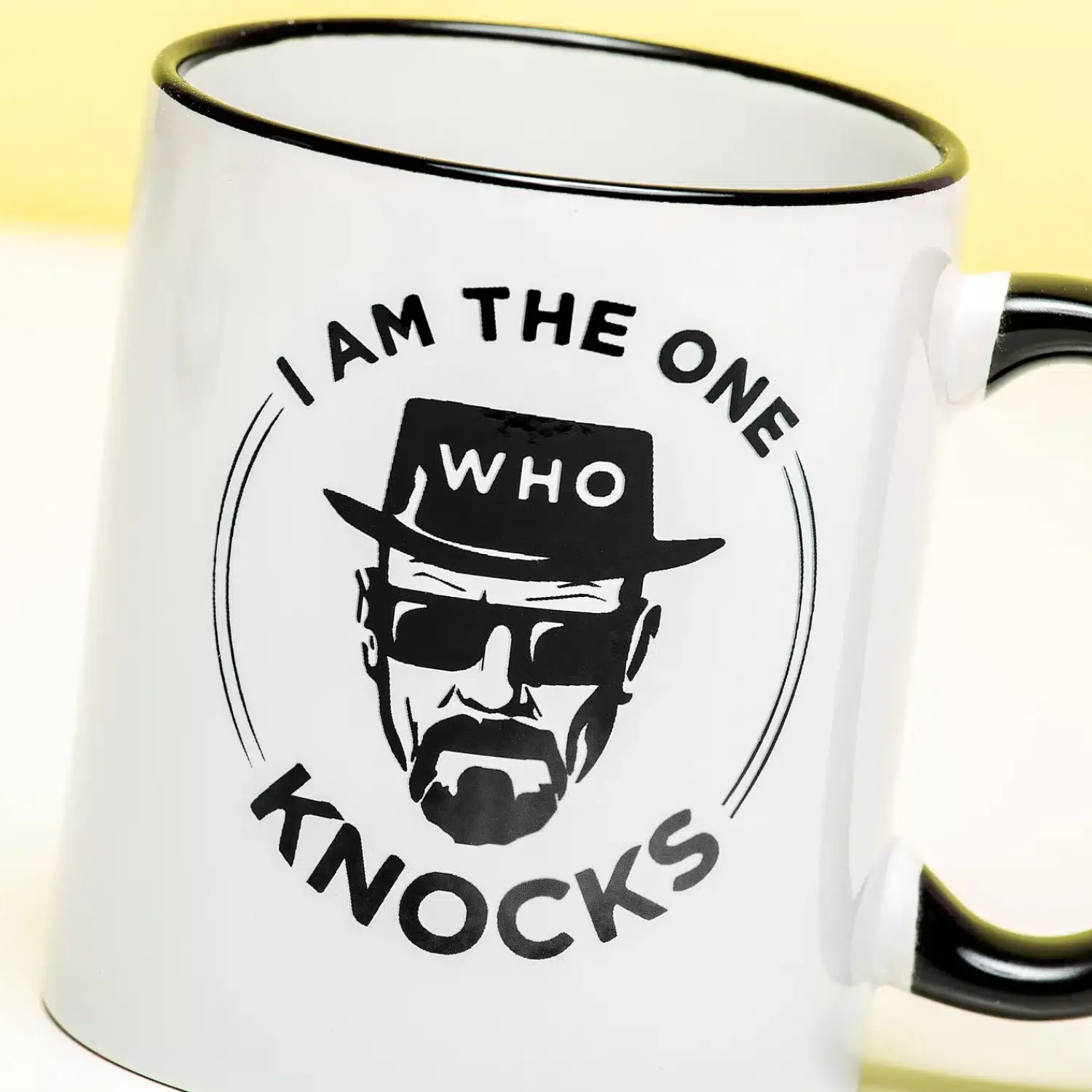 De zin “I am the one who knocks” is één van de meest bekende zinnen uit Breaking Bad. In de beroemde scène vertelt Walter aan zijn vrouw Skylar dat hij niet bang is voor het gevaar, maar dat hij het gevaar ís. De Breaking Bad I Am The One Who Knocks Heisenberg mok is een ode aan dit stuk uit de serie. Vond jij de transformatie van Walter White in zijn alterego Heisenberg ook zo goed. Dan is deze mok echt wat voor jou. De afbeelding van Heisenberg staat samen met de tekst I Am The One Who Knocks op de beker.