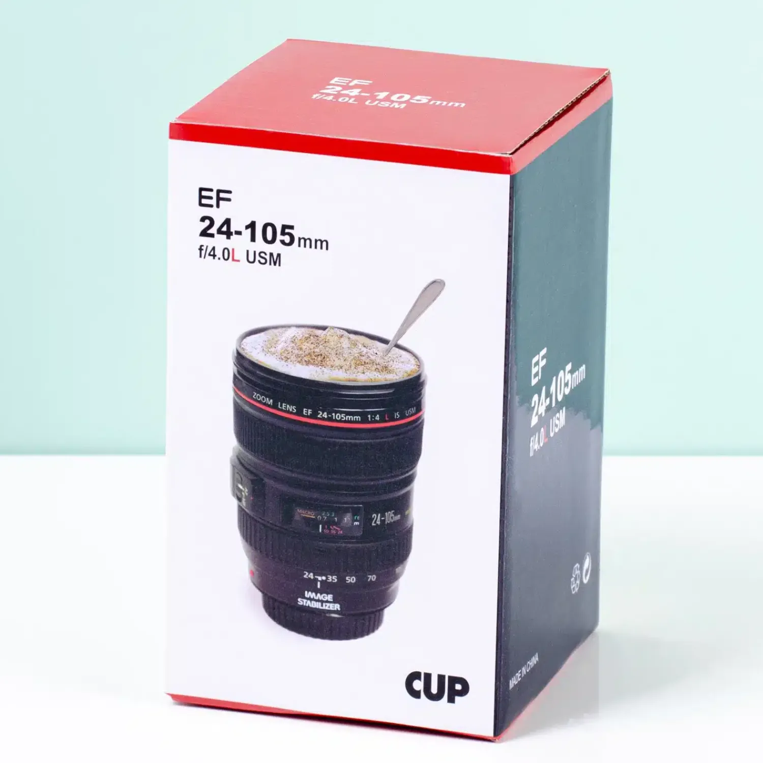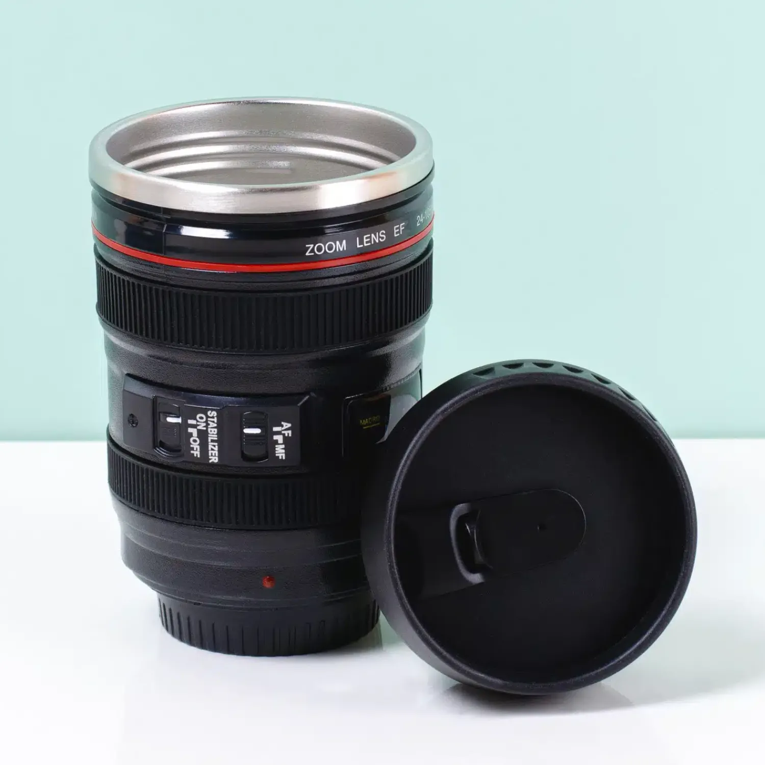 Voortaan drink jij je koffie met stralende glimlach. Je weet namelijk maar nooit wanneer je op de foto wordt gezet. De Cameralens mok is de leukste beker voor modellen en fotografen. Deze beker ziet eruit als een EF24-105 millimeter lens. Foto’s maken doet ‘ie niet, maar hij is prima geschikt om koffie en thee uit te drinken. Heb je een vriend die dol is op fotograferen en zoek je nog een leuk verjaardagscadeau voor hem? Geef hem de cameralens beker cadeau! De beker heeft een deksel met schroefdop.