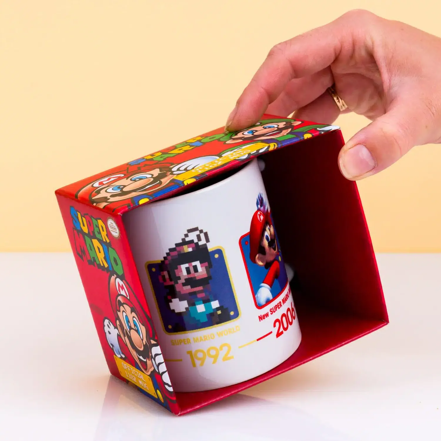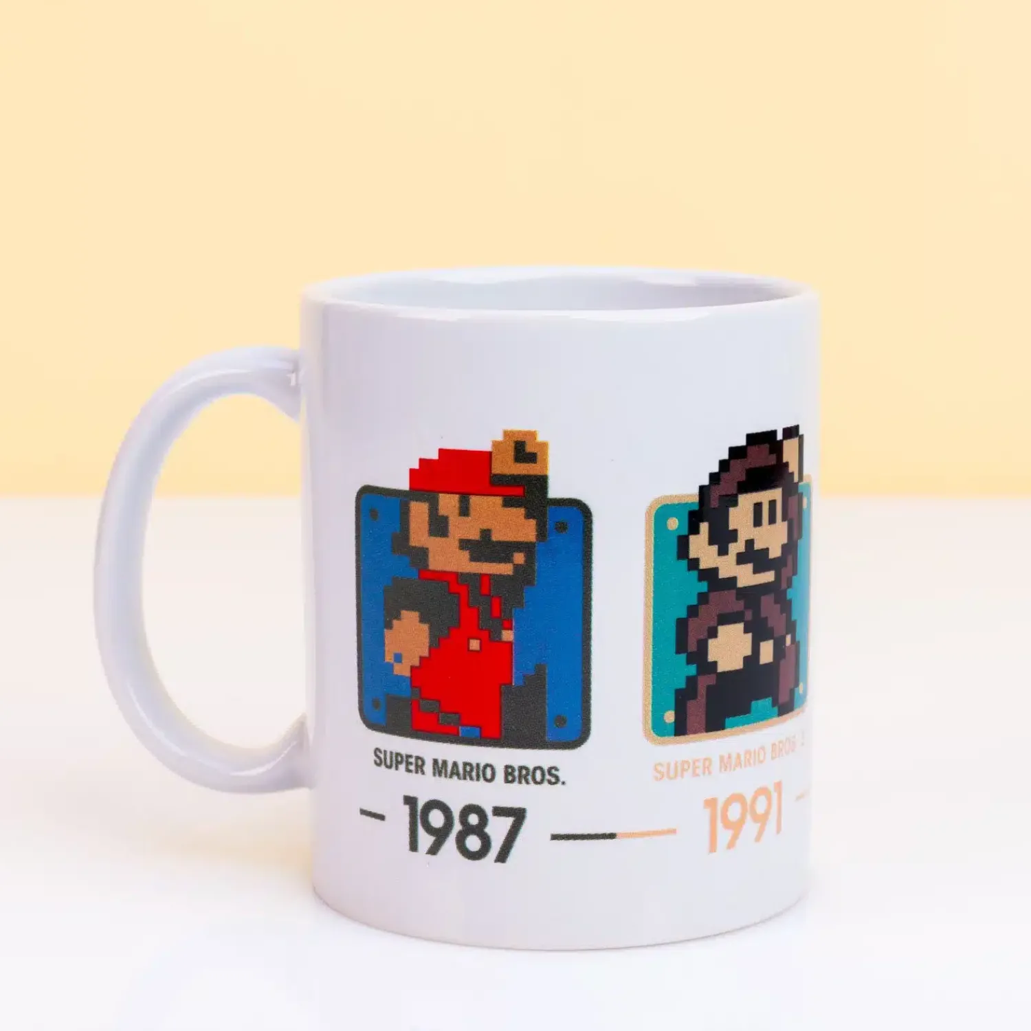 We hebben iets leuks voor Super Mario fans van het eerste uur: de Super Mario Evolutie mok van Nintendo. Een beker met daarop Mario door de jaren heen. Zo zie je hem in 1987, 1991, 1992 en in 2006. Begin je dag goed met wat nostalgie, als je je eerste kop koffie uit deze Super Mario mok drinkt. Een origineel cadeau voor iedereen die nog steeds dol is op Mario.