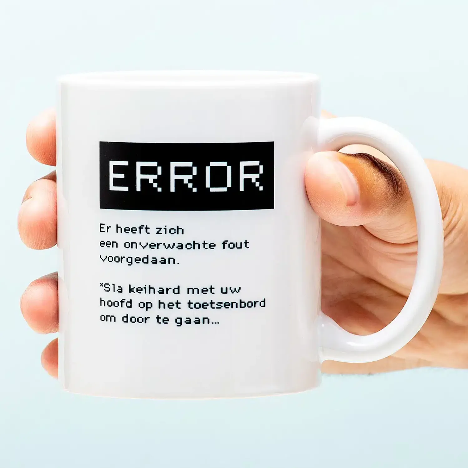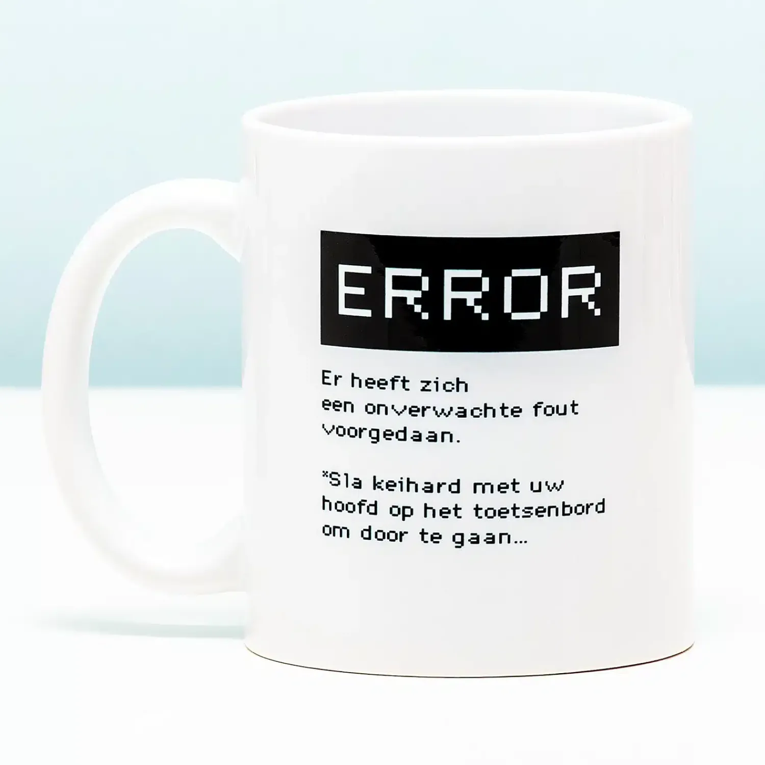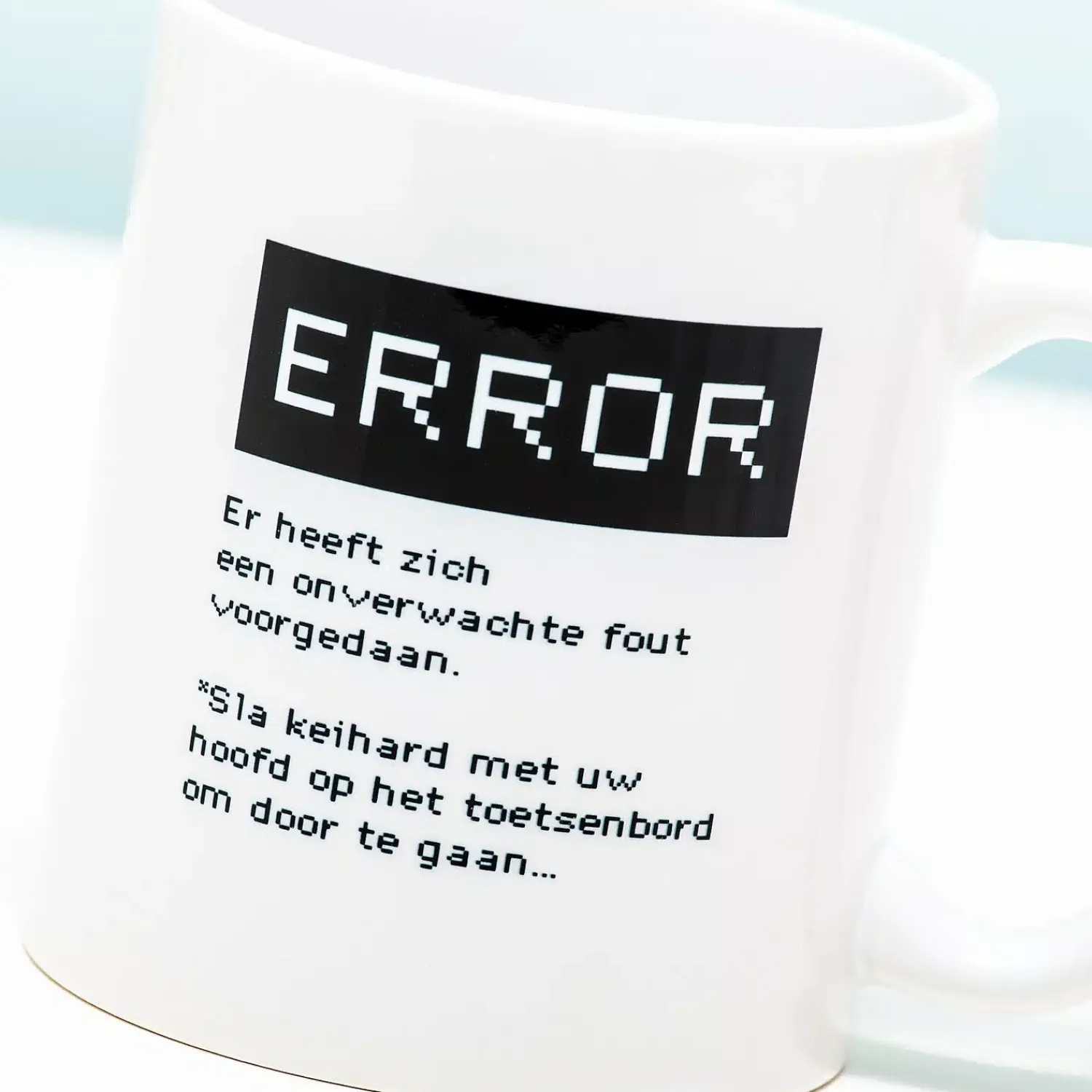 Als je de hele dag achter je computer zit, dan gaat er nog wel eens iets mis. Met de Mok Error worden al je problemen snel opgelost. Nou ja, misschien dan. Op deze grappige mok staat de tekst: Error. Er heeft zich een onverwachte fout voorgedaan. Sla keihard met uw hoofd op het toetsenbord om door te gaan. Een lollig cadeau voor je collega die het regelmatig aan de stok heeft met zijn of haar computer.
