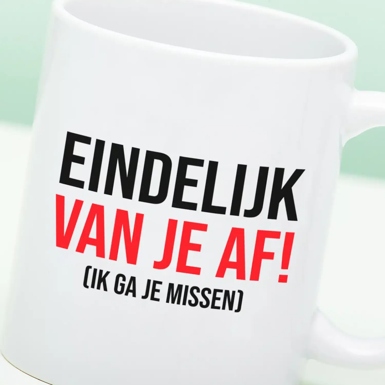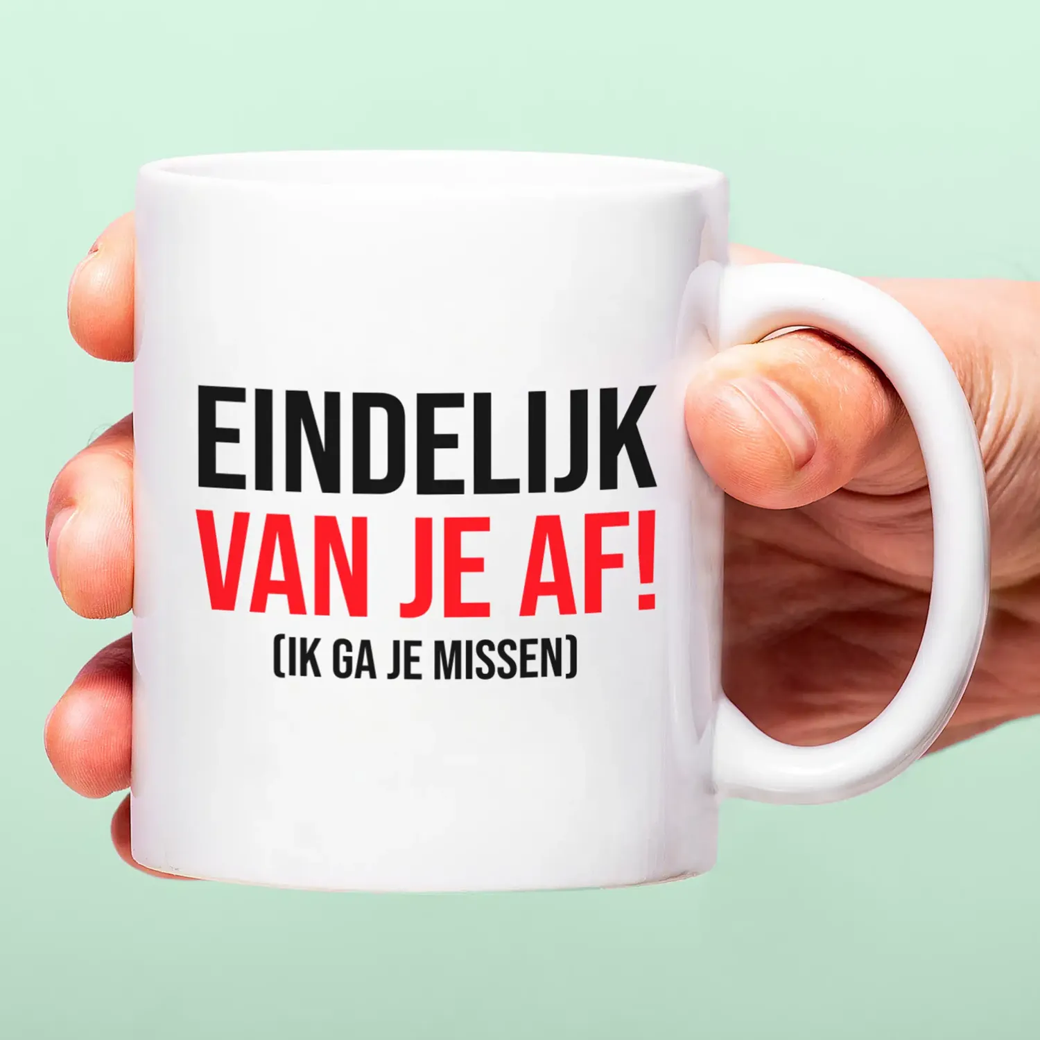 De Mok Eindelijk van je af is het meest eerlijke afscheidscadeau dat je een vertrekkende collega kunt geven. Met deze hilarisch directe tekst maak je duidelijk wat iedereen stiekem denkt bij een afscheid.