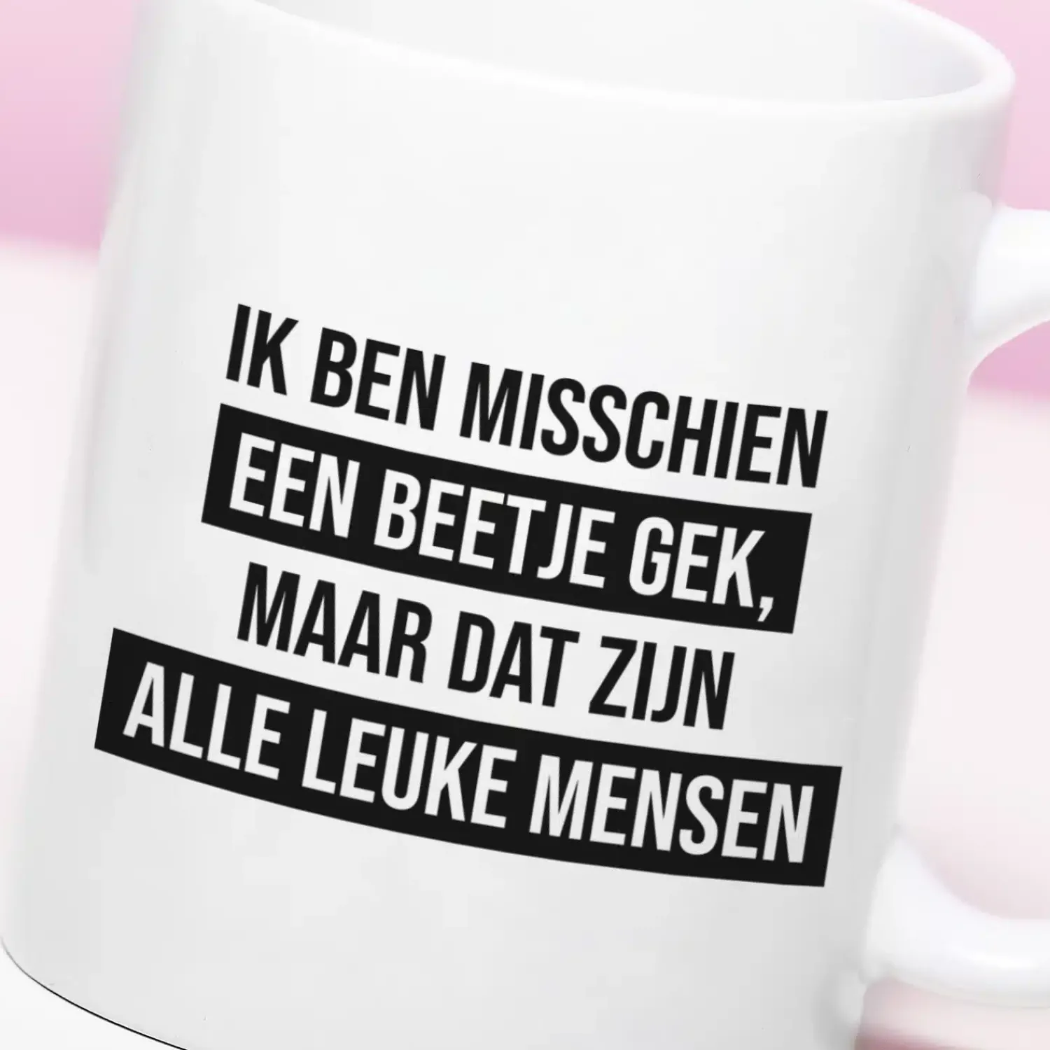 We weten het allemaal: mensen met wie je echt kunt lachen zijn stuk voor stuk een beetje gek. Je beste vriendin bijvoorbeeld. Zij is hartstikke leuk en zeker in voor een gestoorde actie op zijn tijd. Net als jij! Geef je bestie een compliment met de Mok Ik ben misschien een beetje gek. Op deze mok staat de tekst: Ik ben misschien een beetje gek, maar dat zijn alle leuke mensen.