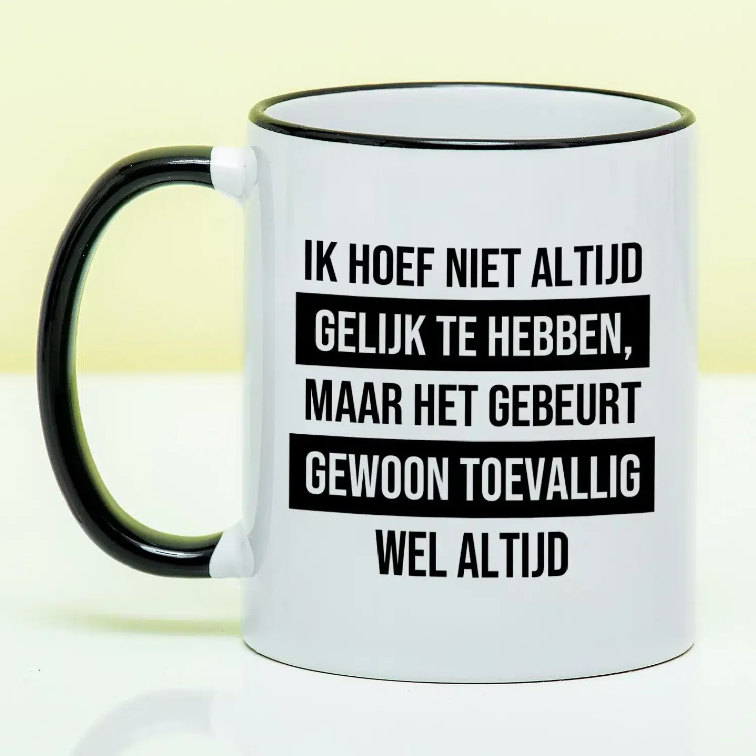 Altijd gelijk hebben is bijna onmogelijk. Behalve voor jou! Jij hebt toevallig altijd gelijk, zelfs als je vrienden, collega’s of familie dat niet wil toegeven. De Mok Ik hoef niet altijd gelijk te hebben is daar het bewijs van. Op de beker staat de tekst: Ik hoef niet altijd gelijk te hebben, maar het gebeurt gewoon toevallig wel altijd. Een grappige mok om cadeau te geven aan betweters en andere koppige types.