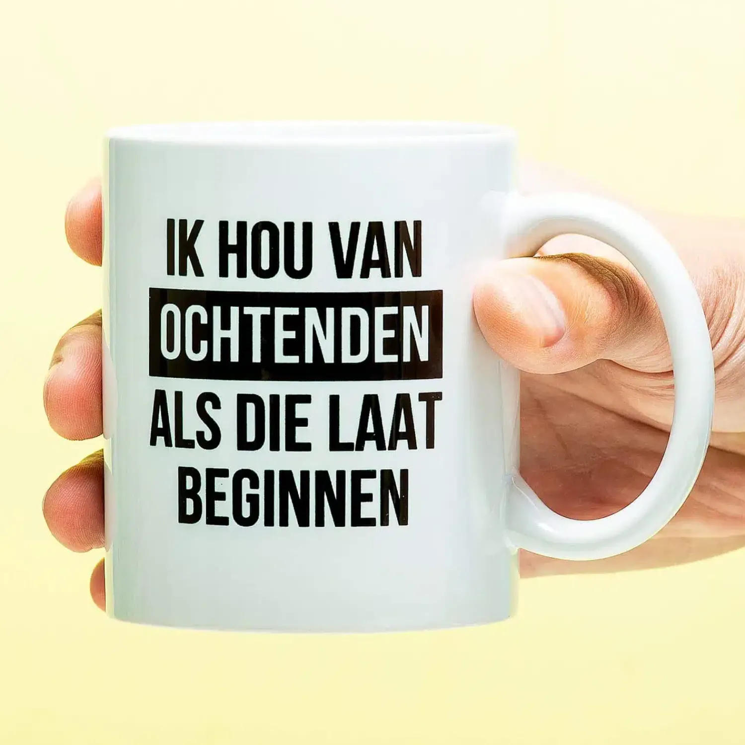 Jij bent dol op ochtenden. Op zaterdagochtend sta je altijd vroeg op bijvoorbeeld, om het meeste uit je dag te halen. De wekker gaat dan al om elf uur. Ja, jij bent een echt ochtendmens. Vervolgens drink je een kop koffie uit de Mok Ik hou van ochtenden als die laat beginnen. Een grappige mok, die je hebt gekregen van een vriend die jou heel goed kent.