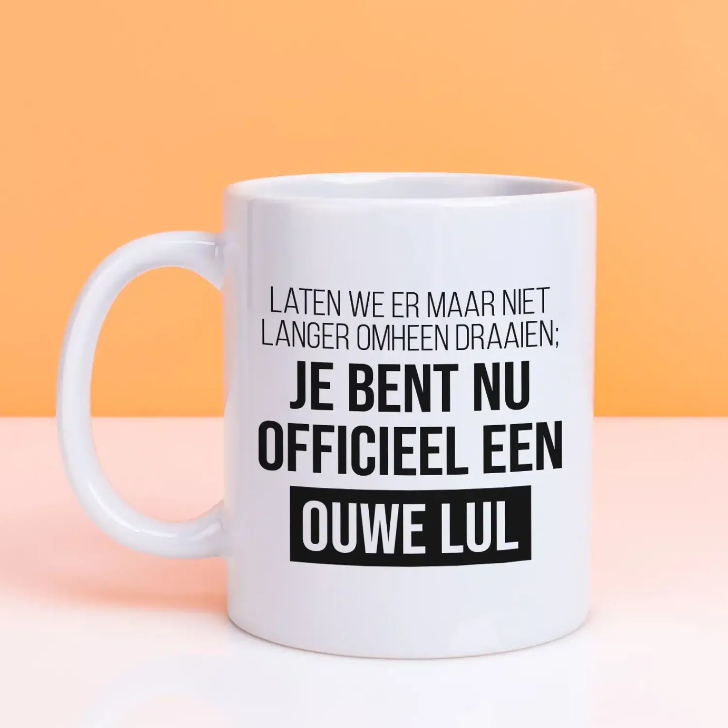 Vroeger was alles beter: de muziek, de mode, alles eigenlijk. Het is dan ook flink schrikken, als de kleding uit je jeugd weer in de mode raakt en je favoriete muziek van toen verwerkt wordt in nieuwe hits. Het is officieel: je bent een ouwe lul. De Mok Je bent nu officieel een ouwe lul is speciaal voor iedereen die die speciale mijlpaal heeft bereikt. Op de mok staat de grappige tekst: Laten we er maar niet langer omheen draaien; je bent nu officieel een ouwe lul.