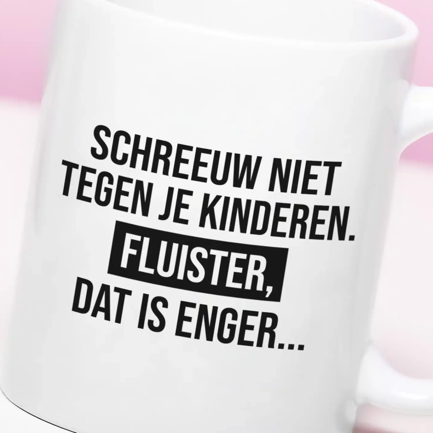 Iedere ouder kent het wel: kinderen die niet luisteren. Tegen ze schreeuwen helpt eigenlijk nooit. Maar weet je wat wel helpt? Fluisteren… Dat is ook de boodschap van de Mok Schreeuw niet tegen je kinderen. Op deze beker staat de tekst: Schreeuw niet tegen je kinderen. Fluister, dat is enger… Misschien houden ze zich voortaan een beetje in, als ze je ‘s ochtends koffie uit deze grappige koffiemok zien drinken.