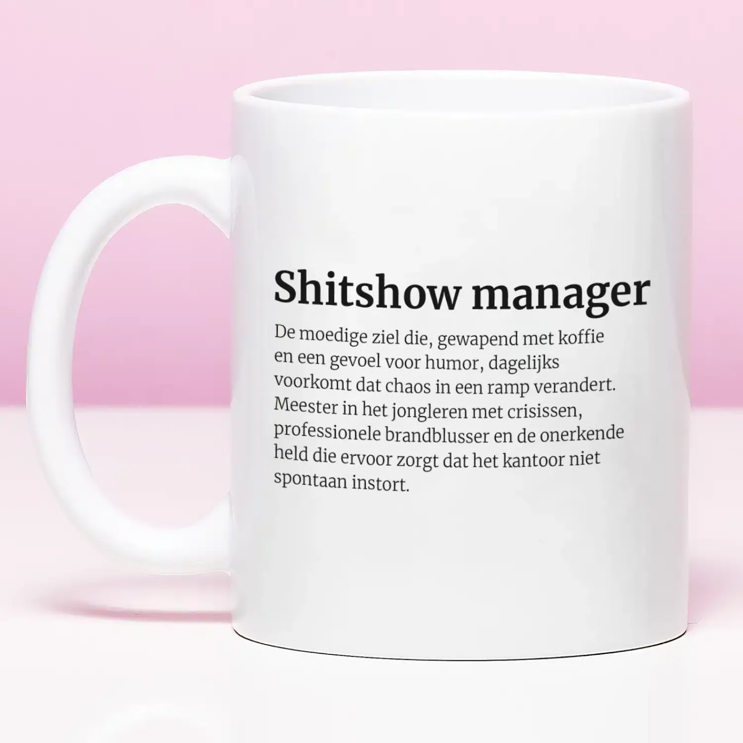 De Mok Shitshow manager is dé koffiebeker voor de held van kantoor. De manager die elke dag brandjes blust, crises in goede banen leidt en er toch nog een grapje tussendoor weet te maken. Een grappige mok voor iedereen die het onmogelijke mogelijk maakt.