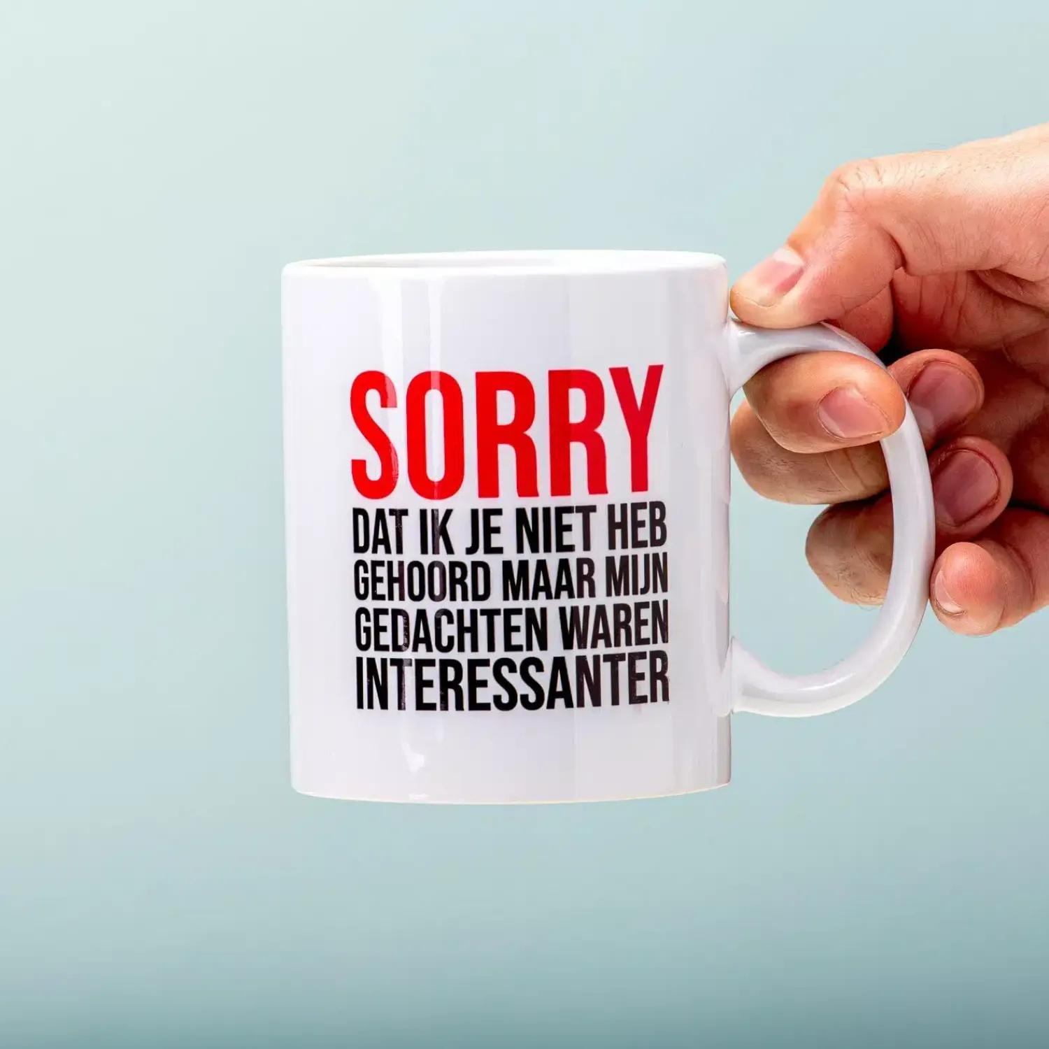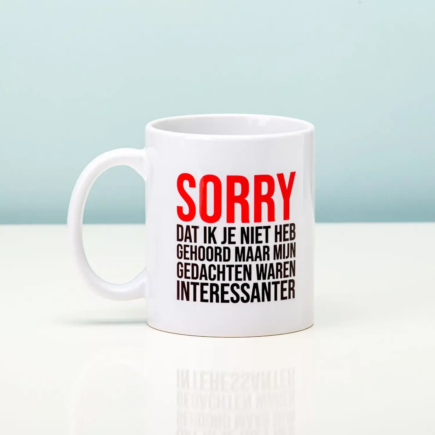 Heb jij ook zo’n vervelende collega die altijd storende opmerkingen maakt? Of een schoonmoeder waar je helemaal niet naar wilt luisteren? Drink dan je koffie of thee uit de Sorry Dat Ik Je Niet Heb Gehoord mok. Op deze beker staat de tekst Sorry dat ik je niet heb gehoord, maar mijn gedachten waren interessanter. Een duidelijke boodschap, toch? De mok is ook heel grappig als cadeautje voor die sarcastische vriendin, die af en toe wel een beetje mag kalmeren.