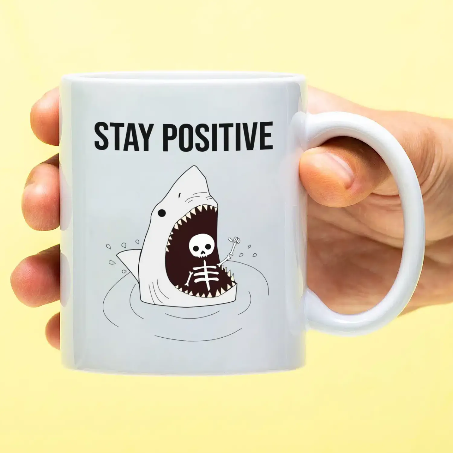 De Mok Stay Positive combineert zwarte humor met een haaien-illustratie. Met de tekst Stay Positive boven een skelet in een haaienbek is dit een mok vol sarcasme.