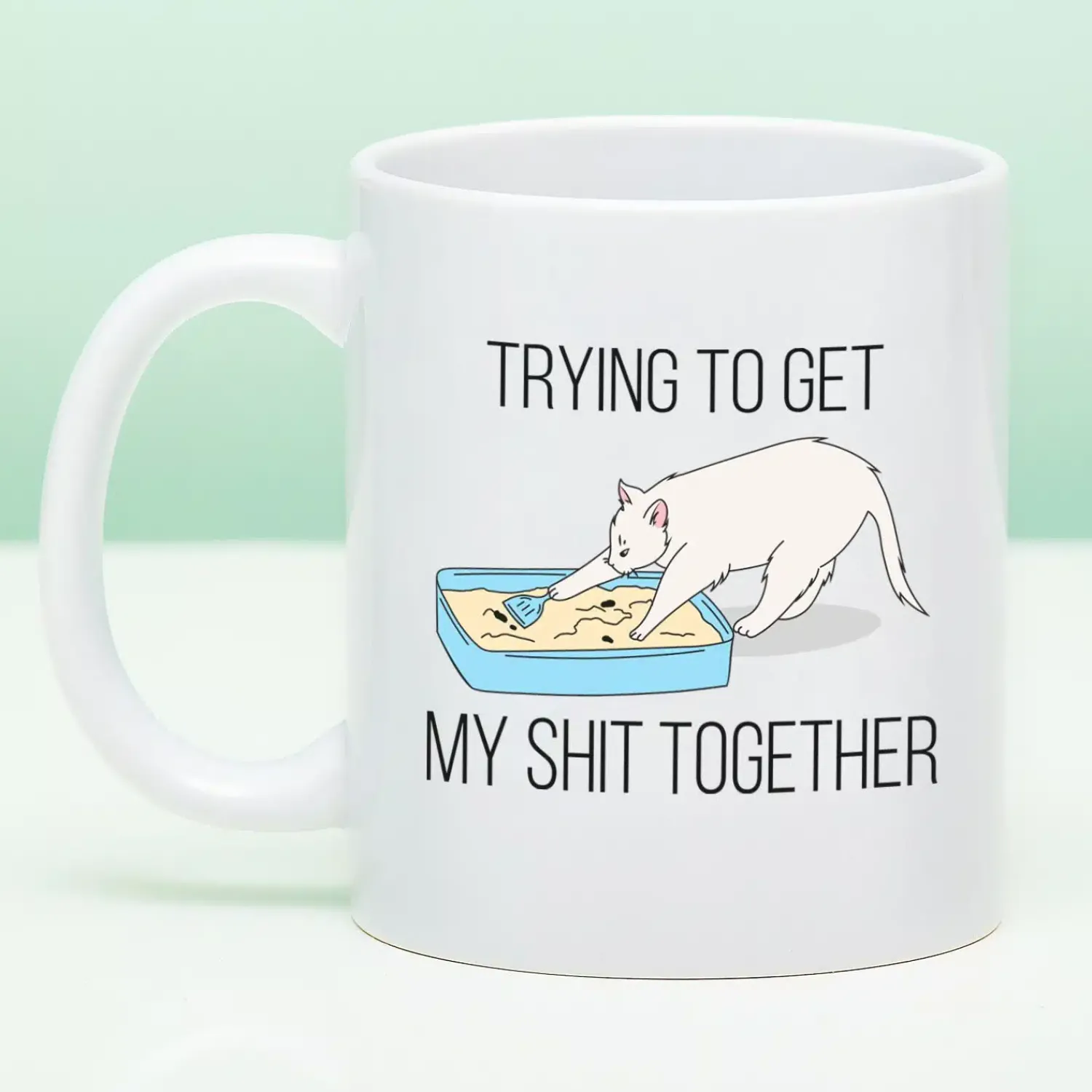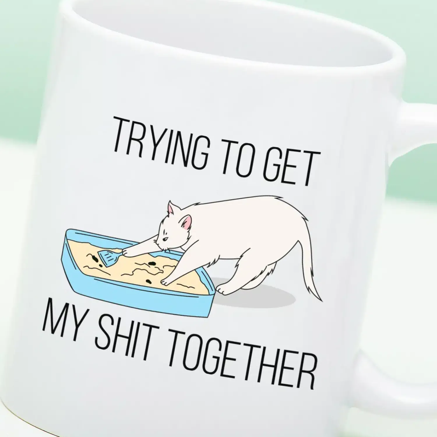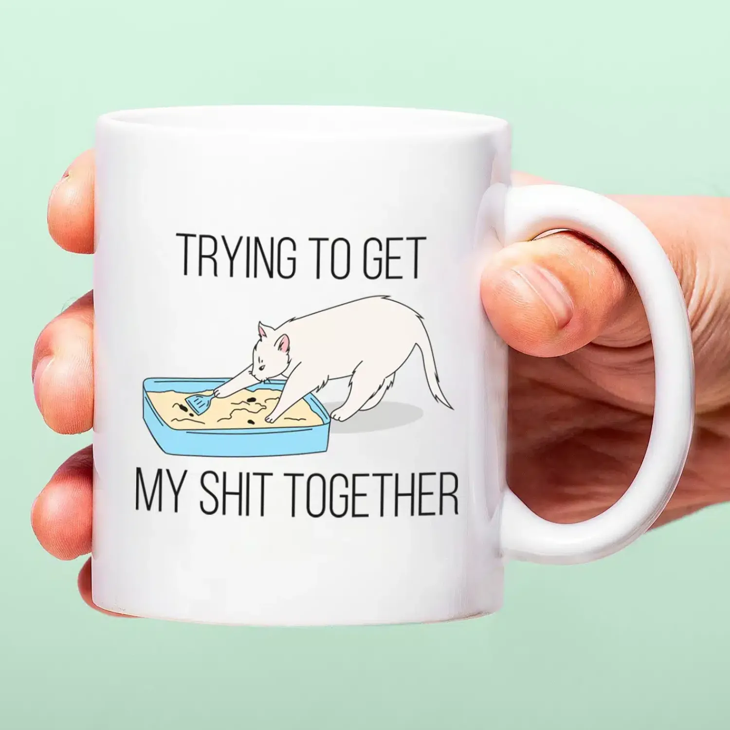 Het is altijd een goed idee om weer op te krabbelen na een moeilijke periode, maar makkelijk is het niet. De Mok Trying To Get My Shit Together beeldt dit uit. Op de mok staat een illustratie van een kat die de kattenbak schoonmaakt, met daarbij de tekst: trying to get my shit together. Geef hem cadeau aan iemand die wel een steuntje in de rug kan gebruiken.