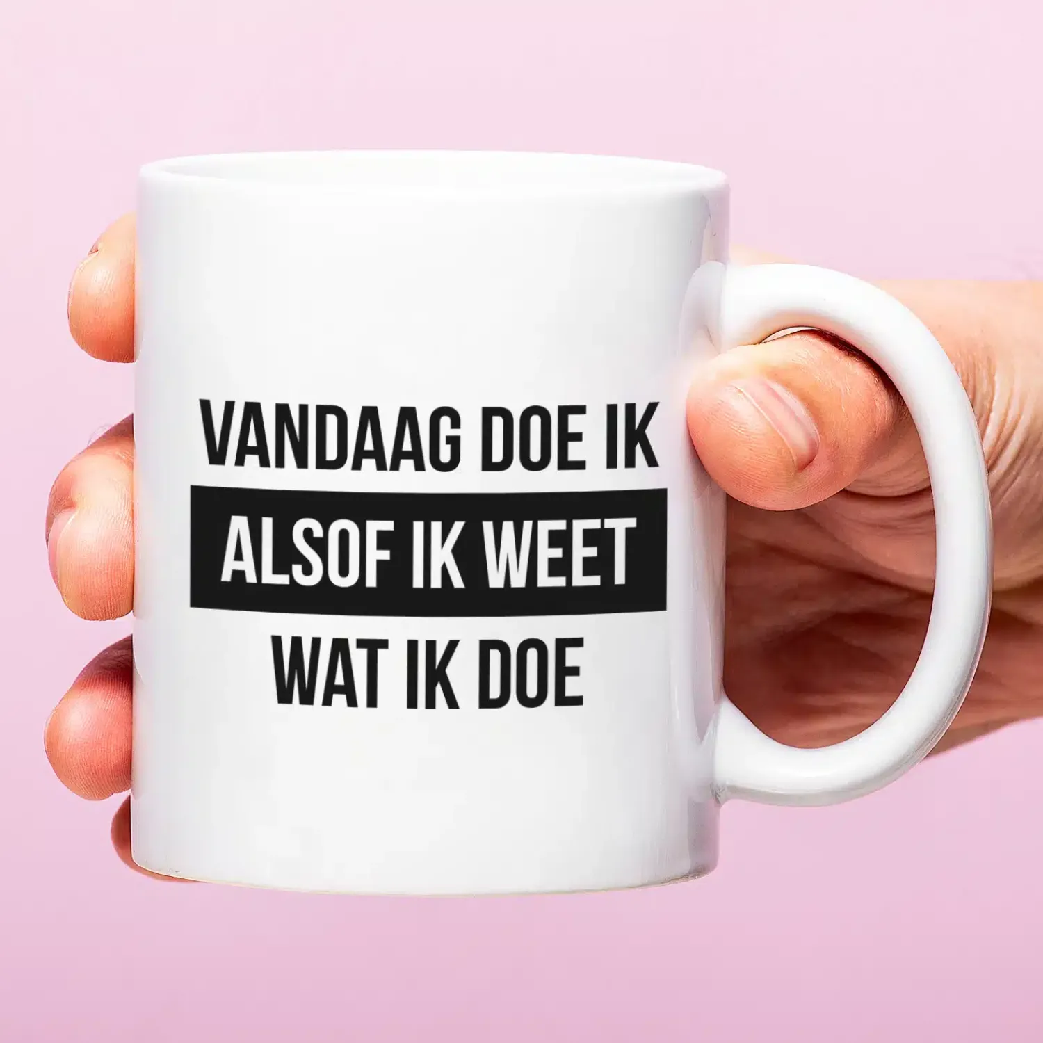 Heb jij regelmatig het gevoel alsof je maar wat doet op het werk en denk je dat je collega’s je daar elk moment op kunnen betrappen? Je bent lang niet de enige die hier last van heeft. De grappige Mok Vandaag doe ik alsof ik weet wat ik doe, speelt hierop in. Op deze mok staat de tekst: Vandaag doe ik alsof ik weet wat ik doe. Voor veel mensen herkenbaar en leuk om cadeau te geven aan een collega.