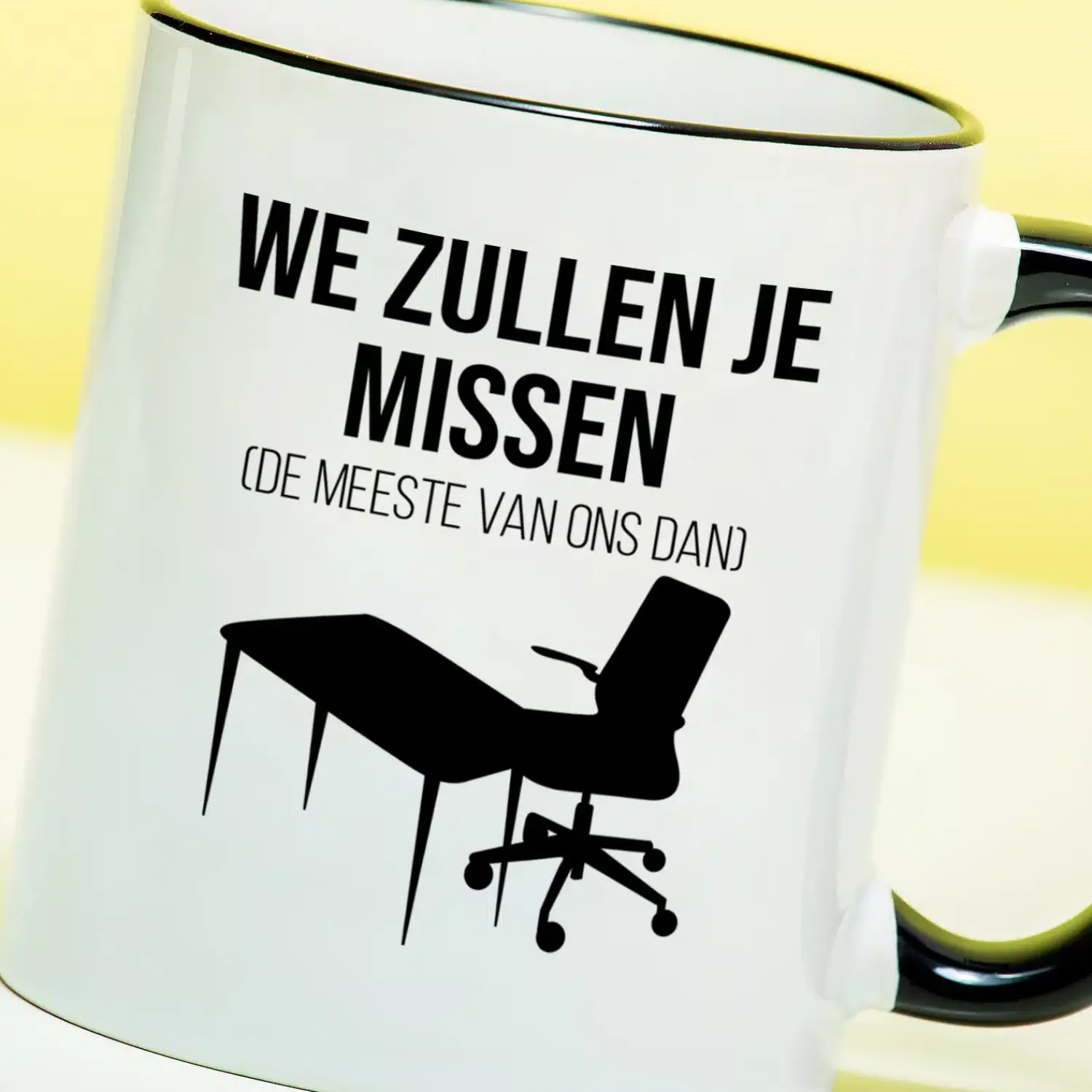 Het voelt een beetje zuur als je favoriete collega een nieuwe baan heeft. Daar past de Mok We zullen je missen goed bij. Op de mok staat een bureau en bureaustoel, plus de tekst: We zullen je missen (de meesten van ons dan). Zo kan de ontvanger nog eens aan je denken als diegene aan zijn nieuwe baan begonnen is.