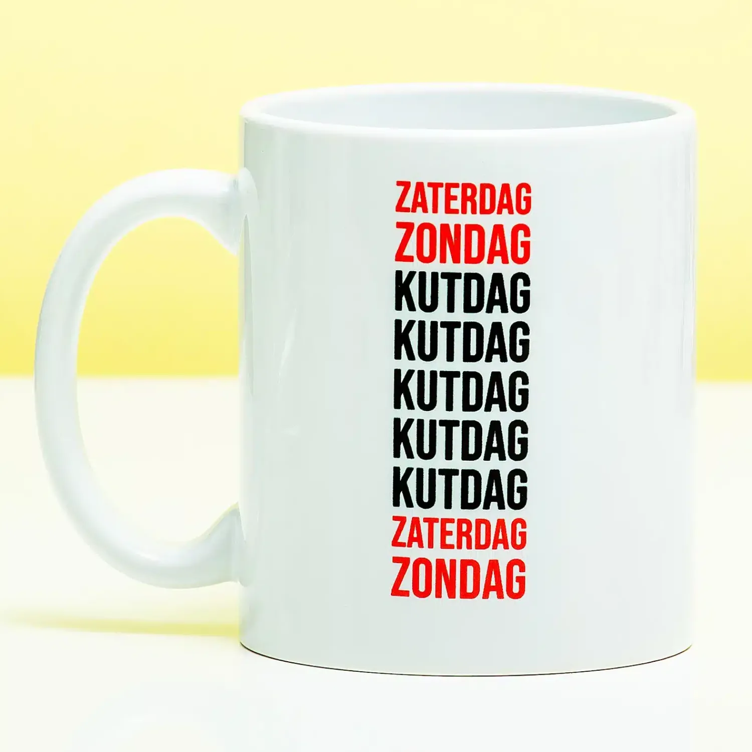 Jij leeft voor het weekend en iedereen mag dat weten. Ja, ook je manager. Neem de Mok Zaterdag, zondag, kutdag daarom gewoon mee naar het werk. Op deze grappige beker staat de tekst: Zaterdag, zondag, kutdag x 5, zaterdag, zondag. Even doorbijten daar op kantoor: voor je het weet is het weer zaterdag!