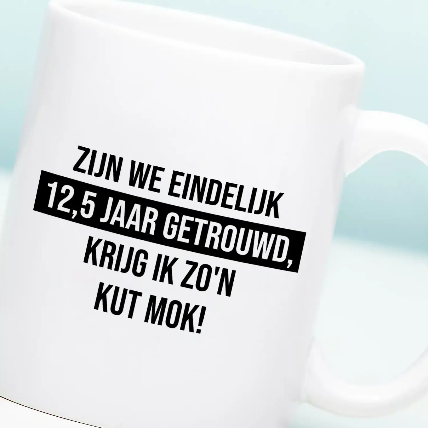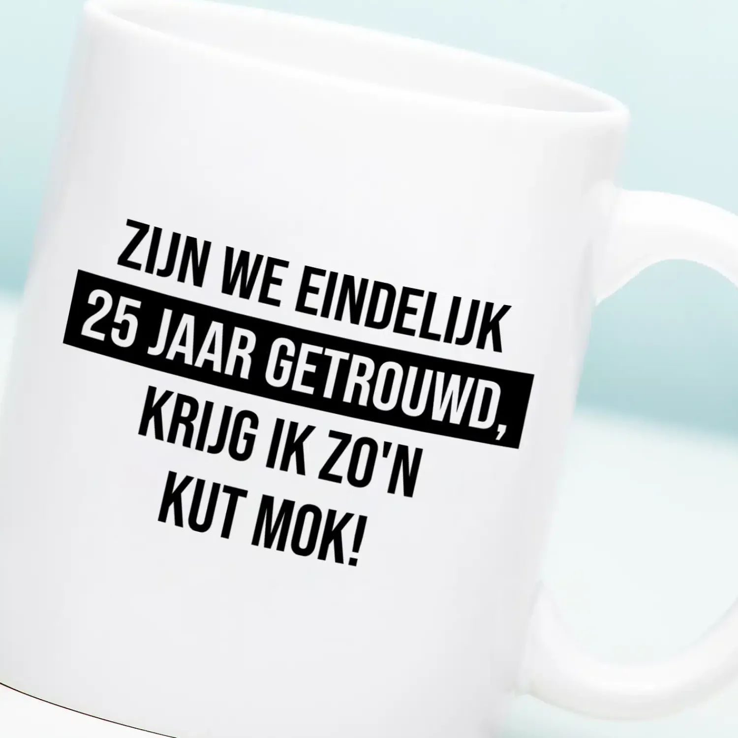 - Met de tekst: Zijn we eindelijk [zoveel] jaar getrouwd, krijg ik zo’n kut mok!