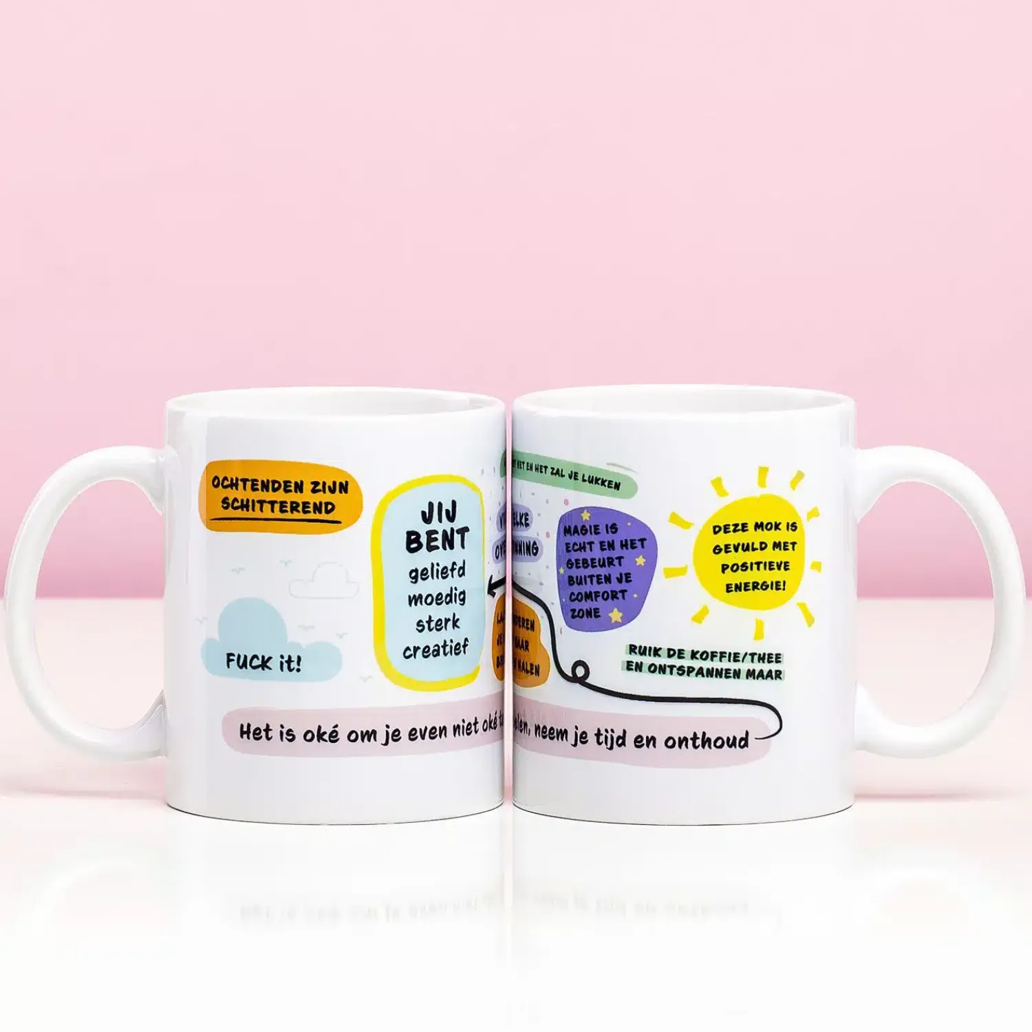 Voelt je beste vriendin zich een beetje down? Kan je broertje wel een oppepper gebruiken? Geef hem of haar deze Motiverende mok. Op deze beker staan lieve en motiverende teksten als: het zal je lukken, deze mok is gevuld met positieve energie, ochtenden zijn schitterend en natuurlijk: fuck it! Met deze zonnige beker tover jij een glimlach op het gezicht van de ontvanger. Wie ga jij blij maken?