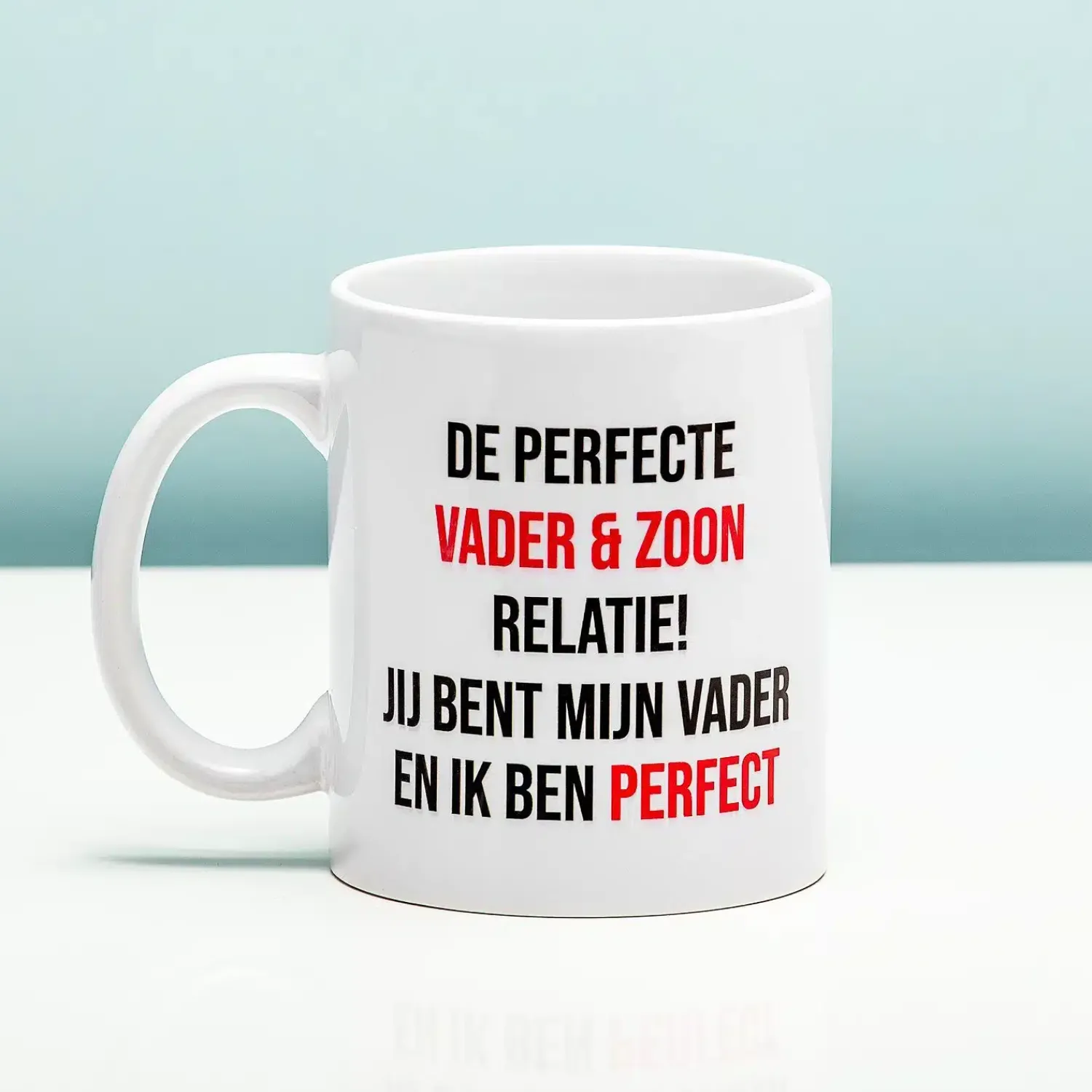 Je vader is je beste vriend. Als kind kijk je tegen hem op, later kijken jullie samen voetbal en is hij degene die je leert om te klussen. Jullie relatie is perfect. En dat kun je bekronen met de Perfecte vader en zoon relatie mok. Op deze grappig mok staat de tekst: de perfecte vader & zoon relatie. Jij bent mijn vader en ik ben perfect. Dan is dat ook weer duidelijk! Deze beker is een leuk cadeau voor bijvoorbeeld Vaderdag of als verjaardagscadeau.
