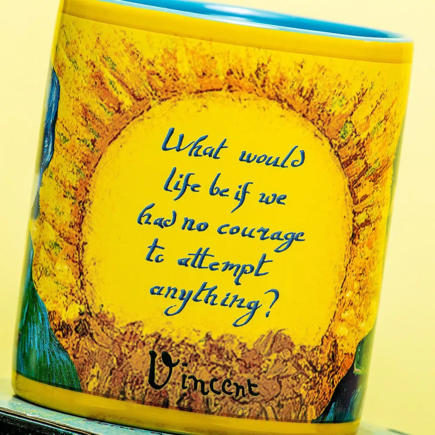 Heb je soms je dag niet? We zijn er vrij zeker van dat jouw dag beter verloopt dan die van Vincent van Gogh, op de dag dat hij zijn oor eraf sneed. De Vincent van Gogh warmtegevoelige mok van The Unemployed Philosophers Guild herinnert je hier aan. De gele mok heeft een zelfportret van Vincent van Gogh. Schenk je er een warme drank in, dan verschijnt er een verband om zijn oor. De oor van de mok heeft – je raadt het al – de vorm van een oor. Op de achterkant staat de quote ‘What would life be if we had no courage to attempt anything?’