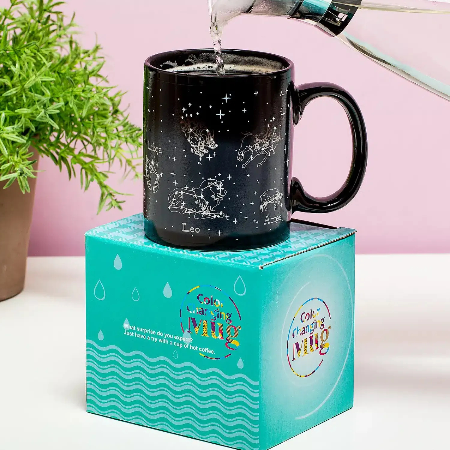 Altijd al eens de sterrenbeelden van de Dierenriem willen zien, maar heb je geen zin om laat op te blijven? Geen nood, met deze Warmtegevoelige beker met sterrenbeelden kun jij ze gewoon op elk moment zien. Deze mok reageert op warmte en wanneer er hete drank in wordt geschonken, komen onder andere sterrenbeelden zoals Steenbok, Boogschutter en Waterman tevoorschijn. Door de verandering wordt het drinken van een warme drank een magisch moment. Schenk hete koffie, thee of chocolademelk in de beker en geniet van de transformatie.