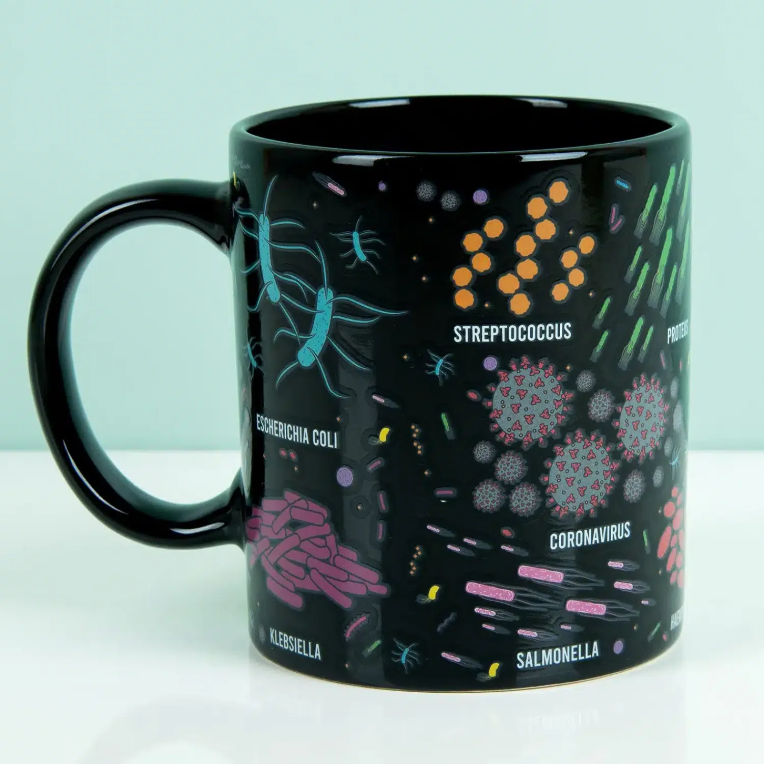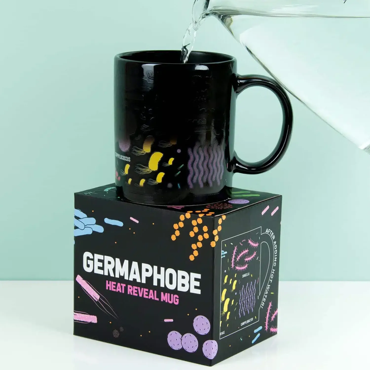 Lopen de rillingen over jouw rug als je weet dat je op een plek moet gaan zitten waar eerder iemand anders zat? Heb je standaard natte doekjes in je tas? Dan is de Warmtegevoelige germafoob mok van Gift Republic niks voor jou. Maar we kunnen niet beloven dat je vrienden hem niet cadeau zullen doen als cadeautje. De mok lijkt in eerste instantie gewoon een zwarte mok. Maar schenk je er een hete drank in, dan verschijnen er allemaal bacteriën op de mok. Van salmonella tot streptokokken en e-coli: deze bacteriën houden je gezelschap als je je koffie drinkt.