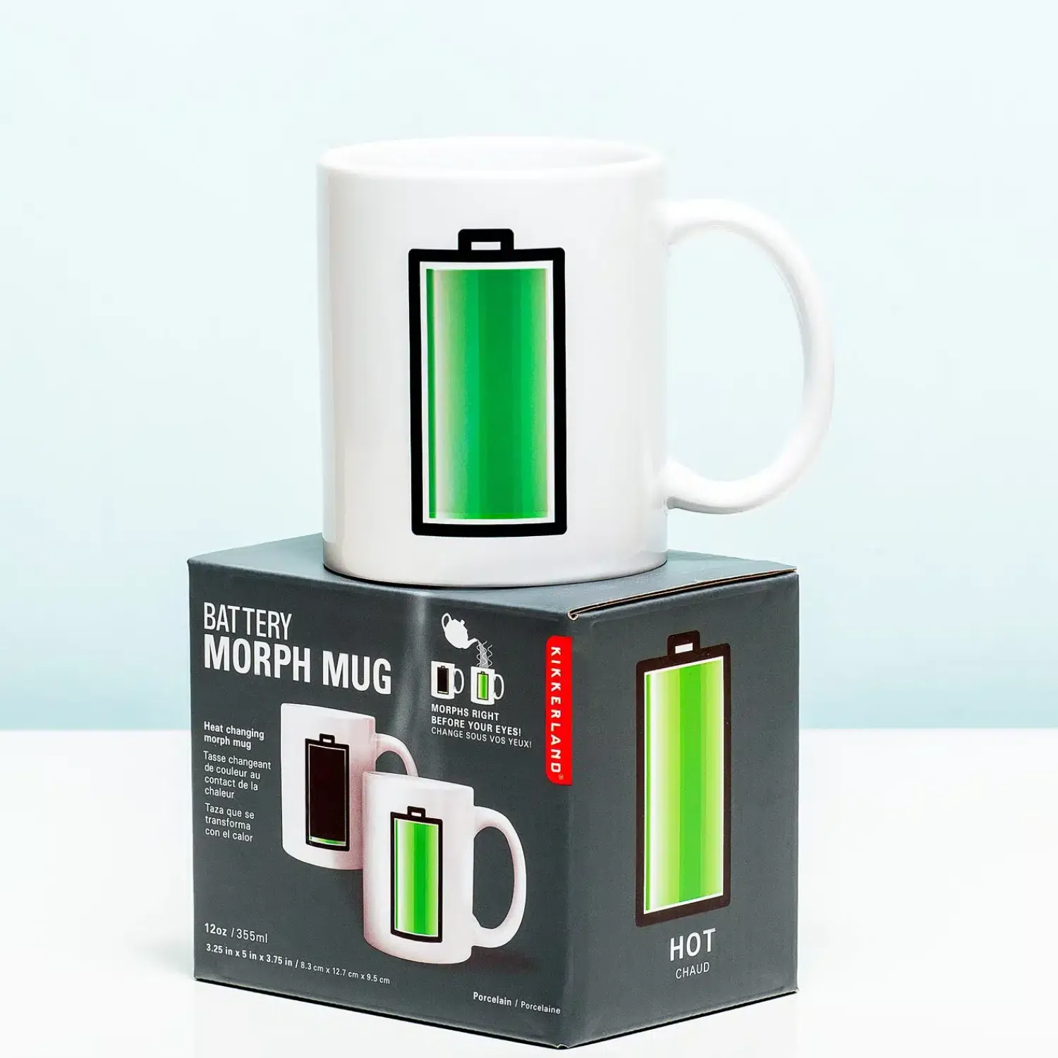 Ben je nog niet helemaal wakker? Begin je dag volledig opgeladen met de Warmtegevoelige mok Batterij van Kikkerland. Schenk je warme drank in de beker en de batterij laadt zichzelf op. Het zwarte balkje wordt door de warmte langzaamaan steeds groener. Als de drank afkoelt of de mok leeg is, wordt de batterij vanzelf weer zwart. De beker mag dan een lege batterij hebben, die van jou is tenminste helemaal opgeladen. Met de Kikkerland-mok Batterij met thermografische inkt heb je nooit meer een lege batterij. Verandert de batterij terug naar zwart, drink dan snel je warme drank op om er weer tegenaan te kunnen.