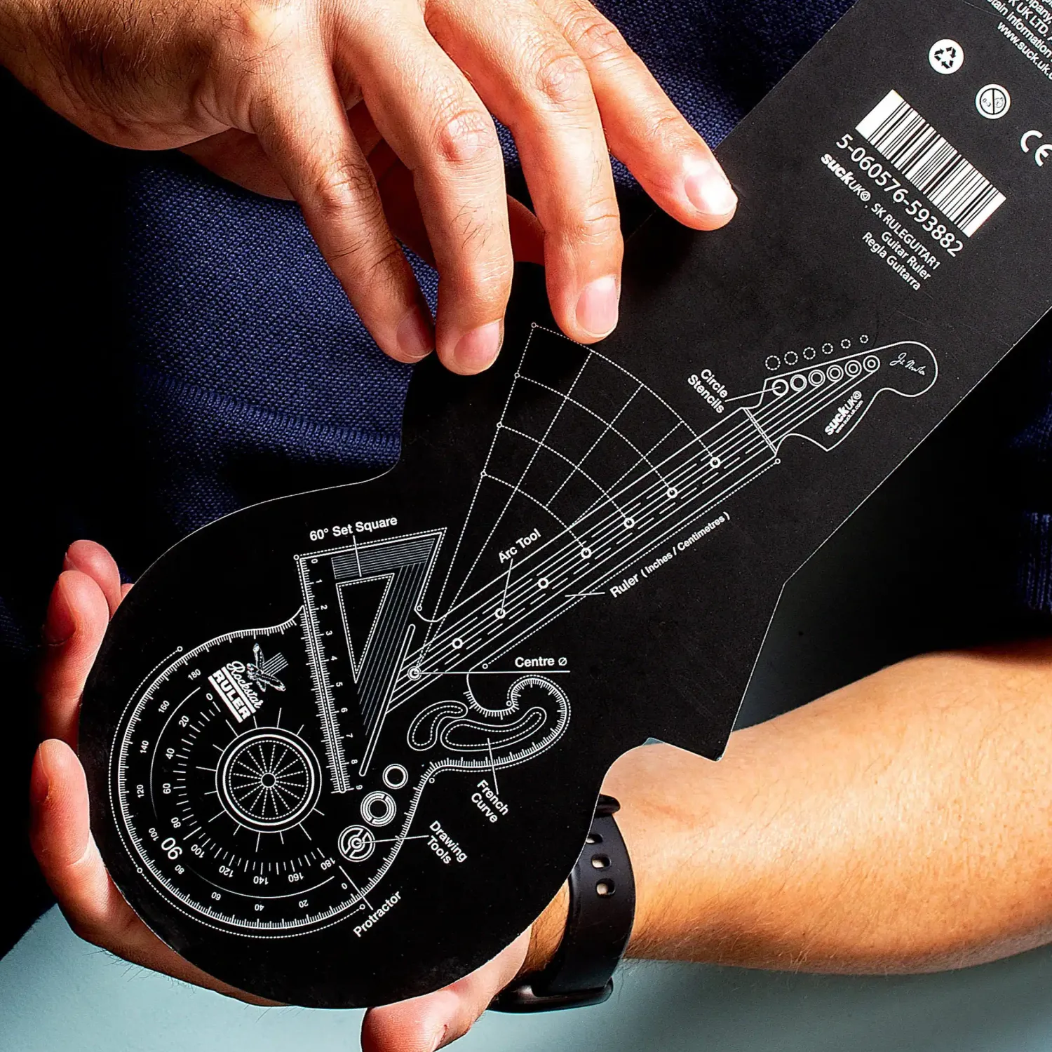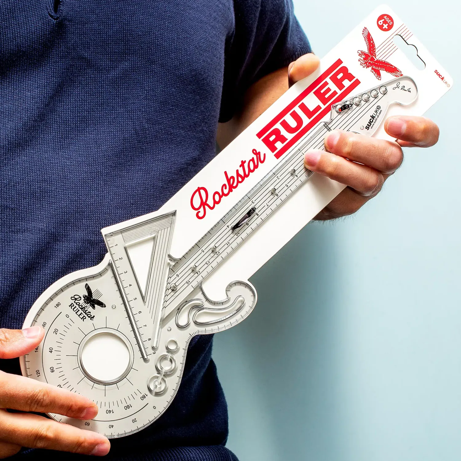 Vind je wiskunde ook zo’n rotvak? Al die formules en stellingen gaan je niet in de koude kleren zitten als je op de middelbare school zit. Maar met de Rockster liniaal van Suck UK rock jij je volgende proefwerk! Deze liniaal, in de vorm van een elektrische gitaar, zorgt ervoor dat je kunt meten als de beste. In de multifunctionele liniaal zit een gradenboog, lange lineaal (15 centimeter of 6 inches), arc tool voor gebogen lijnen en een geodriehoek. En het trekken van keurige rechte en gebogen lijnen wordt zo natuurlijk ook een fluitje van een cent. Heb je pauze en wil je indruk maken op je klasgenoten? Speel dan een potje luchtgitaar met de Rockstar Ruler!