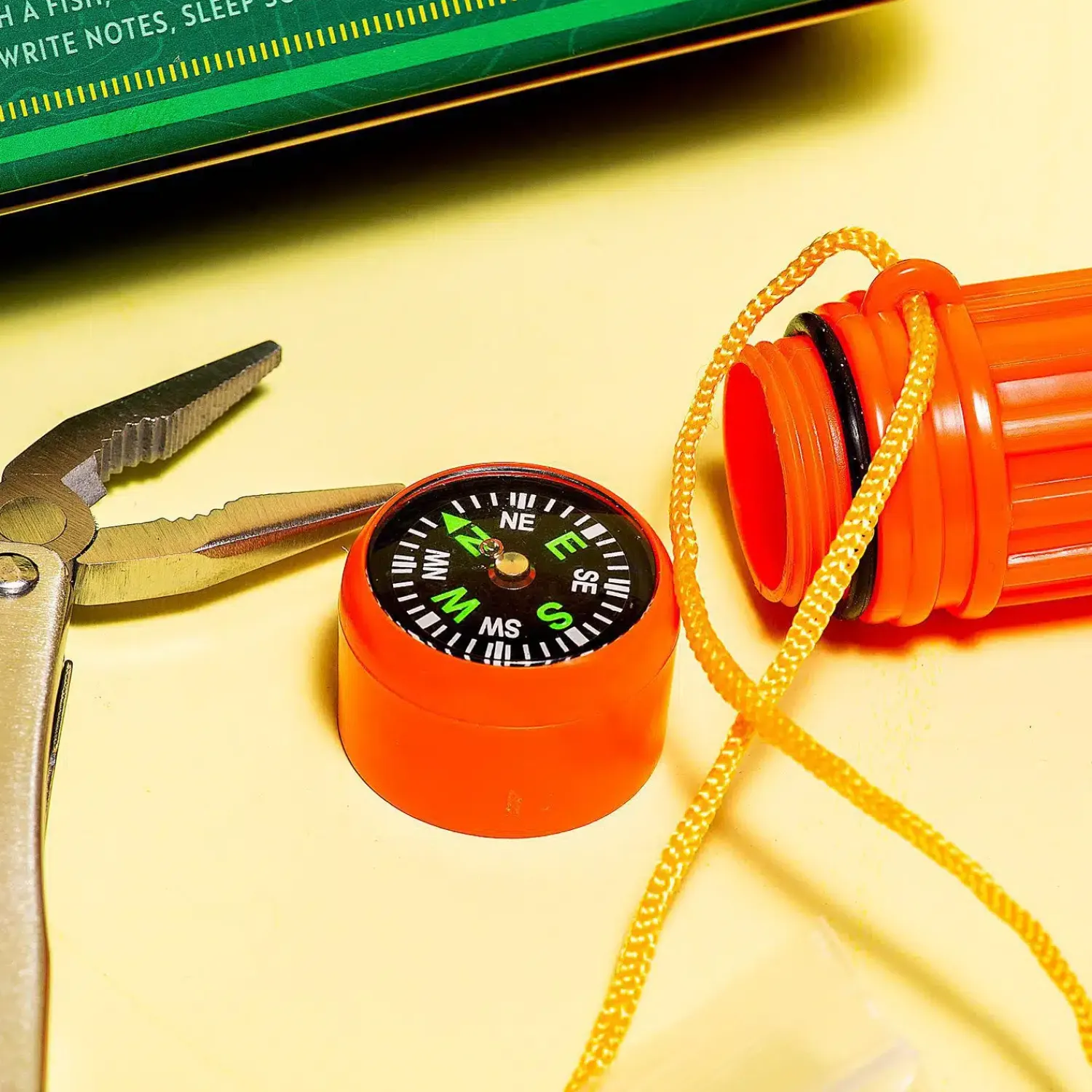 Kamperen in de bossen, zonder telefoon? Kan best, als je de Survivalkit in een blikje van Kikkerland bij je hebt. Want mocht je verdwalen, dan kun je je weg terug proberen te vinden met het kompas, een vis te vangen met de vislijn, hout zagen met het zaagje, vervolgens vuur maken met de vuursteen en lekker warm en rustig slapen met de oordopjes en nooddeken. Een welkome afwisseling van je drukke leven, toch?
