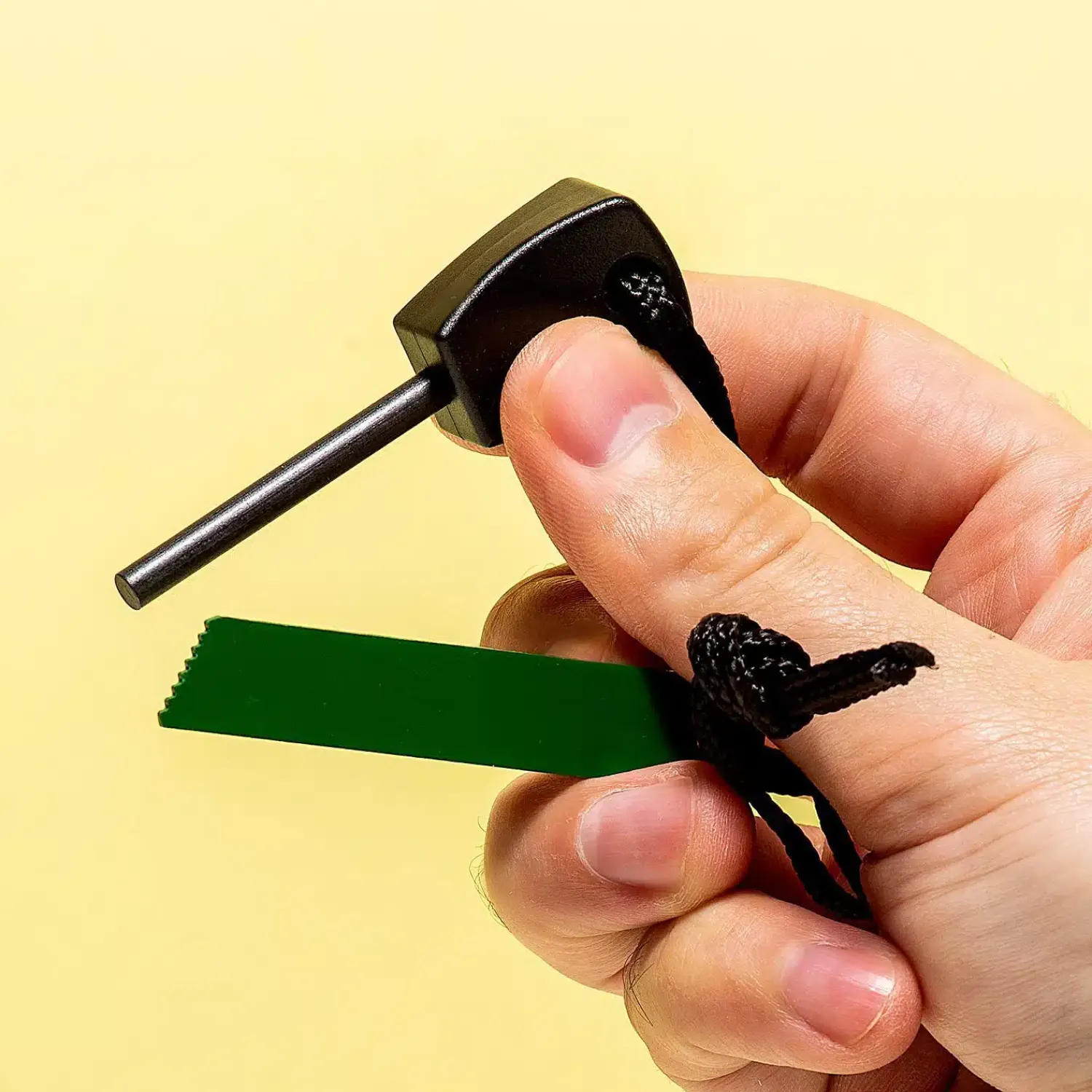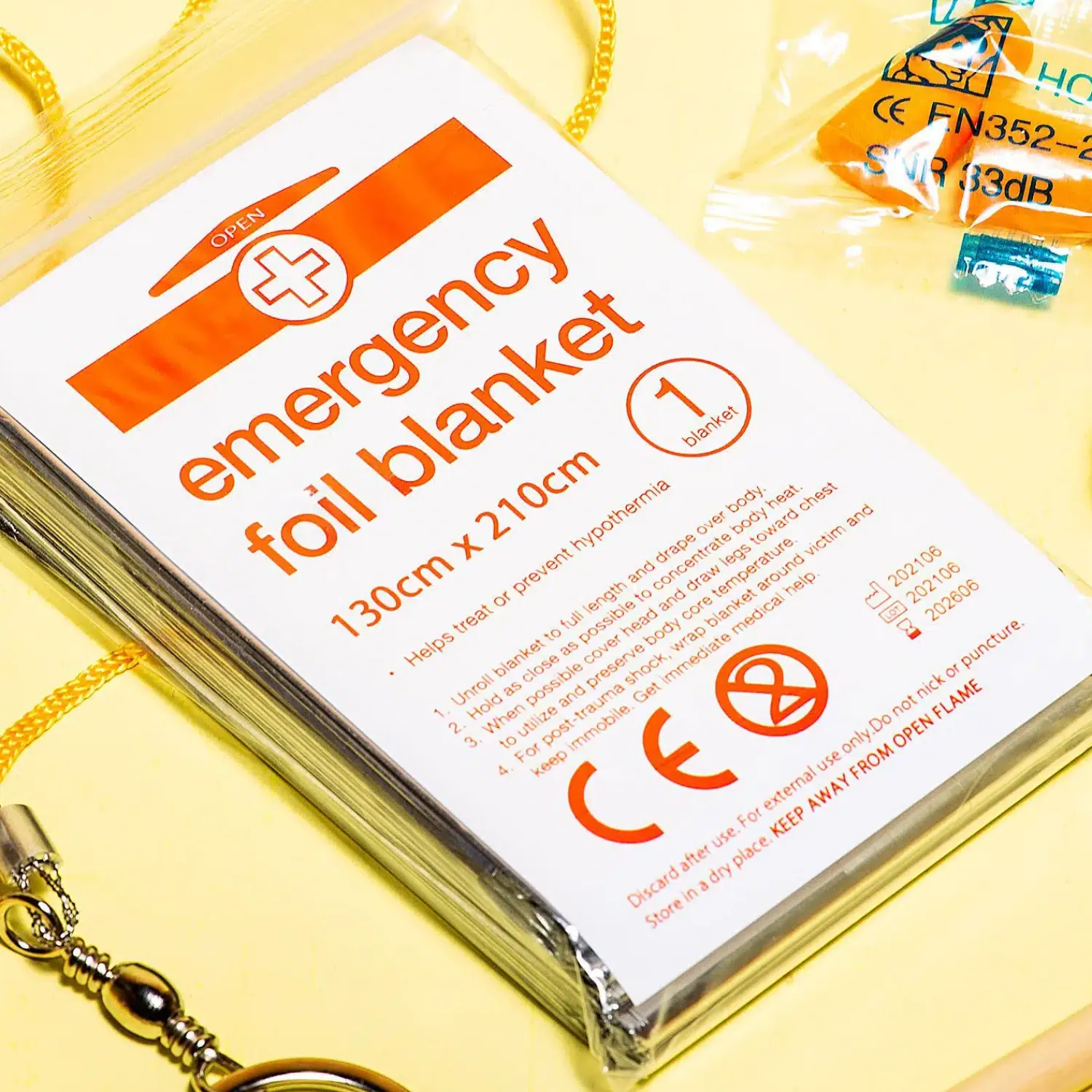 - Met een nooddeken, ijzerzaagdraad, 5-in-1 fluitje met kompas, oordopjes, potlood, waxinelichtje, vuursteen, scheermesje, multifunctioneel mes en vislijn