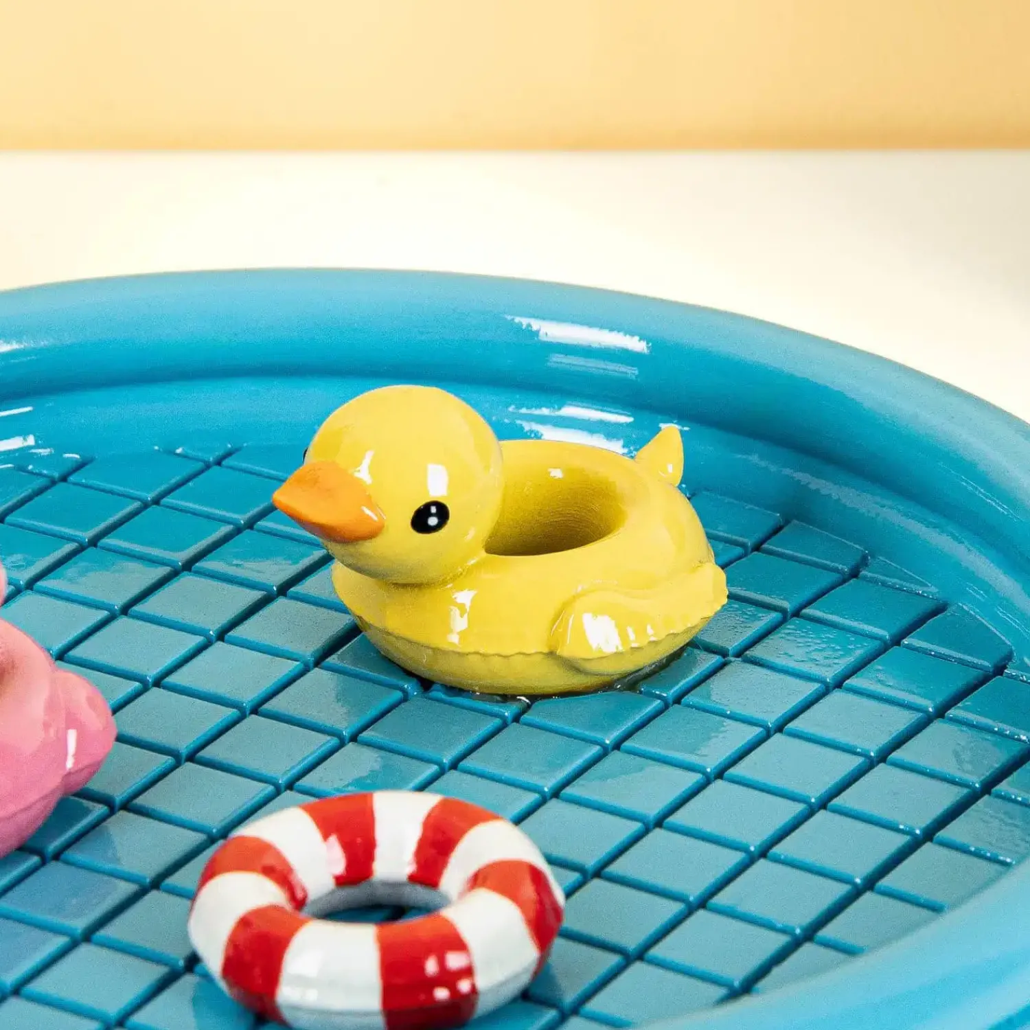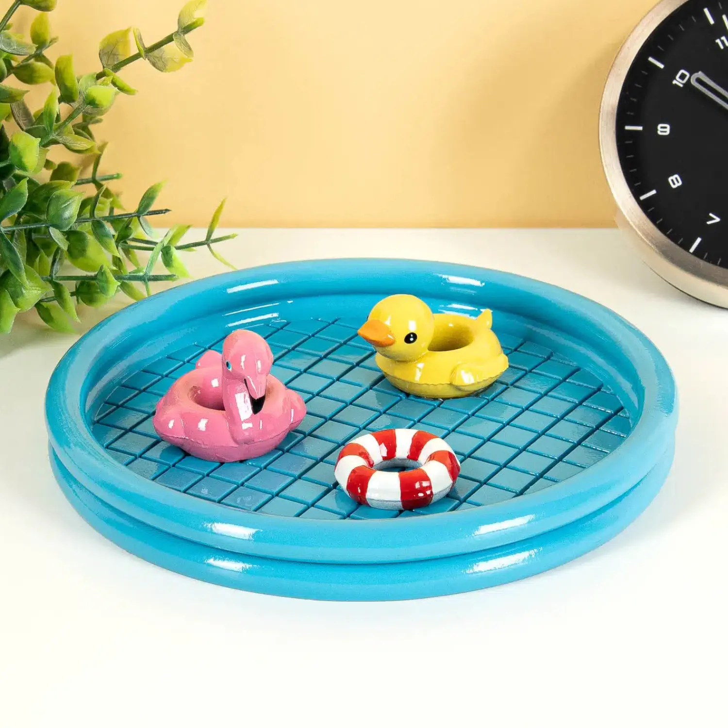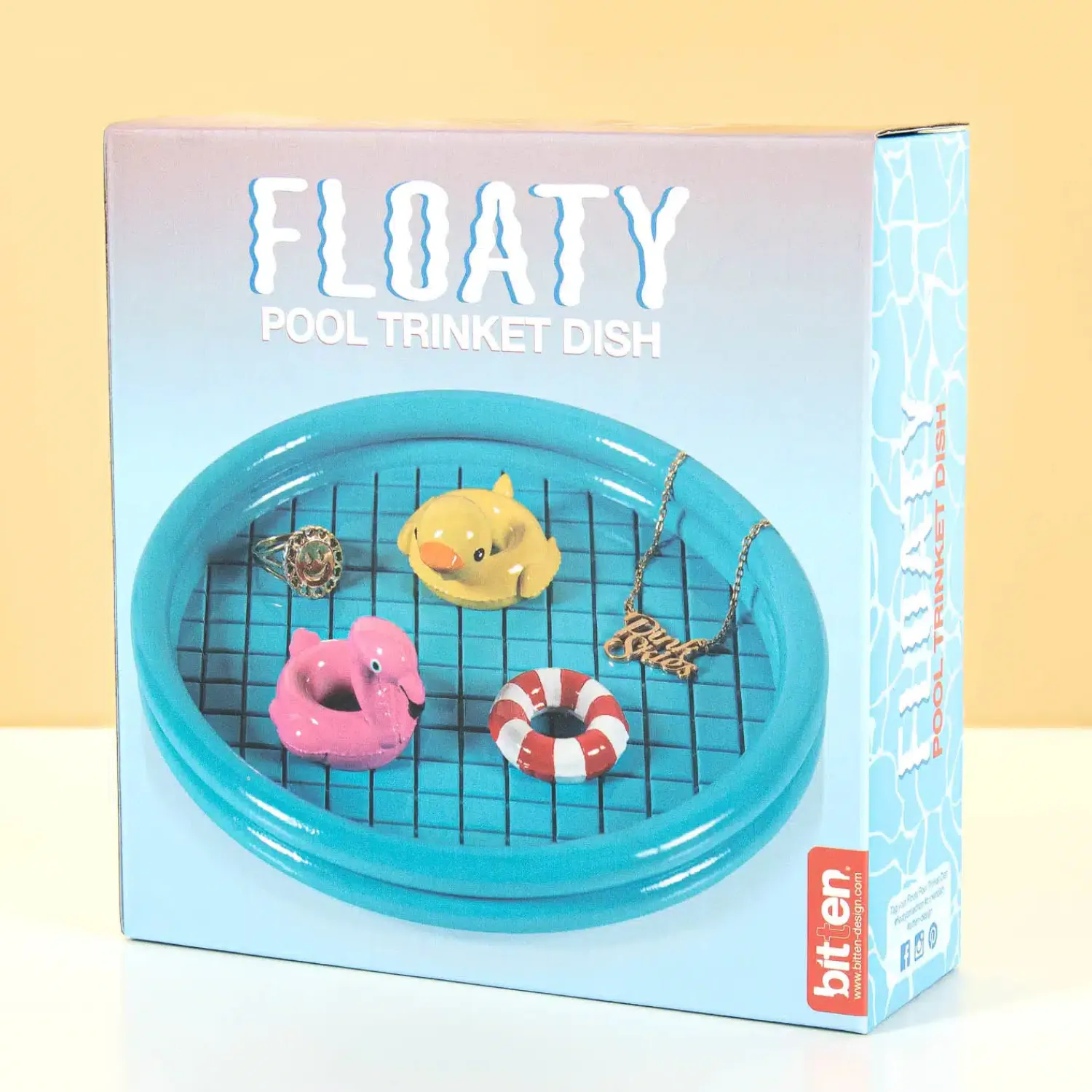 Met het Zwembad sieradenschaaltje van Bitten is het niet alleen makkelijk om je sieraden terug te vinden, het staat nog vrolijk ook. Dit schaaltje is perfect voor je kleine schatten: van piercings en oorbellen tot je sleutelbos. Het sieradenschaaltje lijkt op een zwembad: er drijven zelfs zwembanden in!