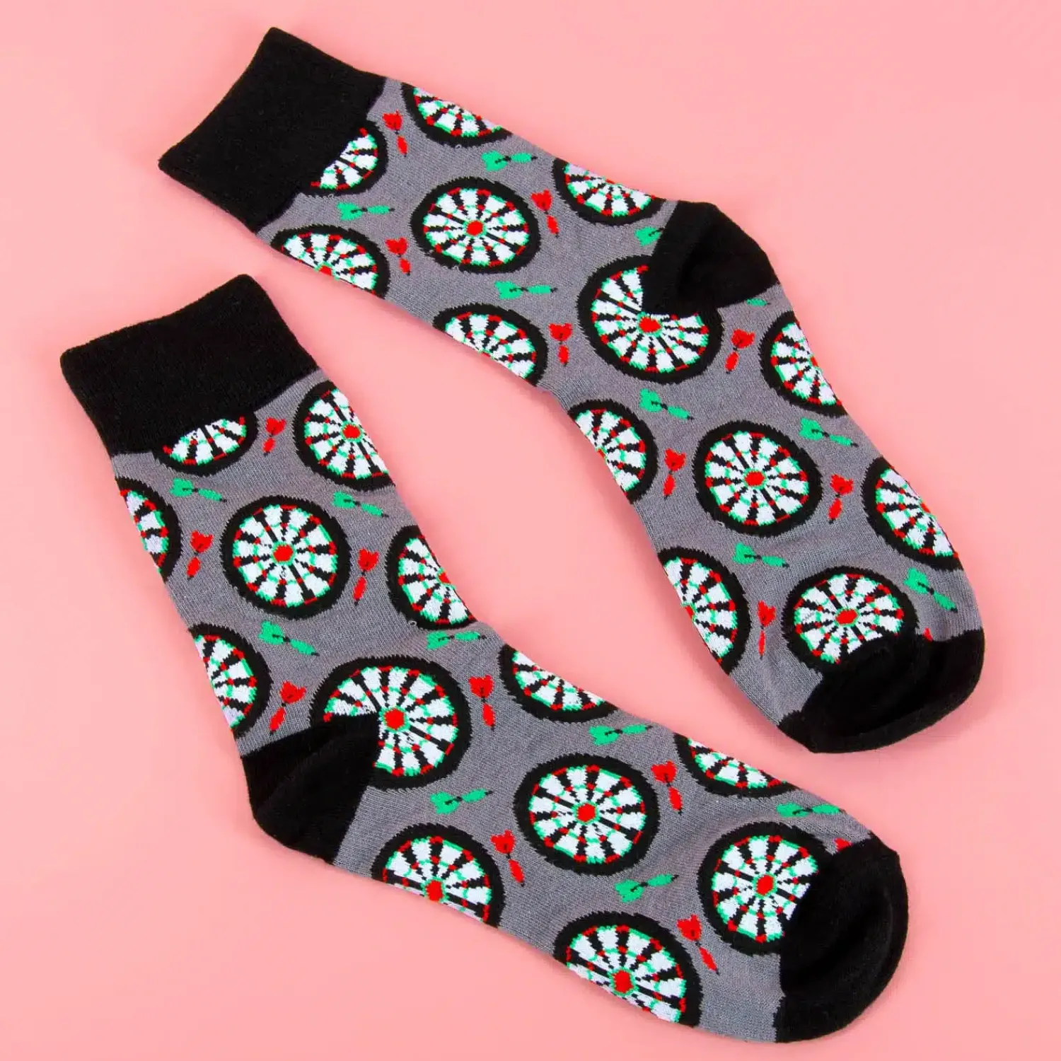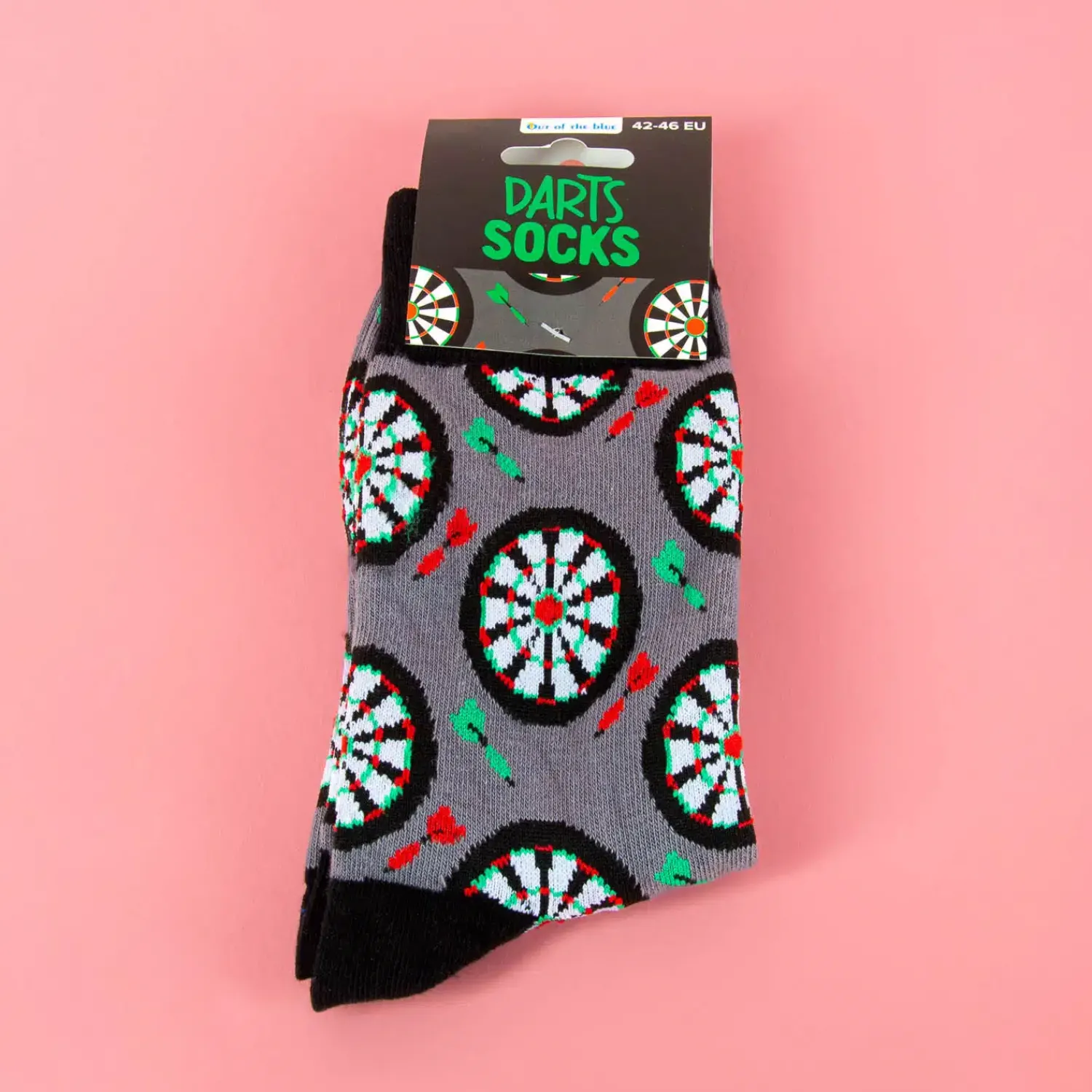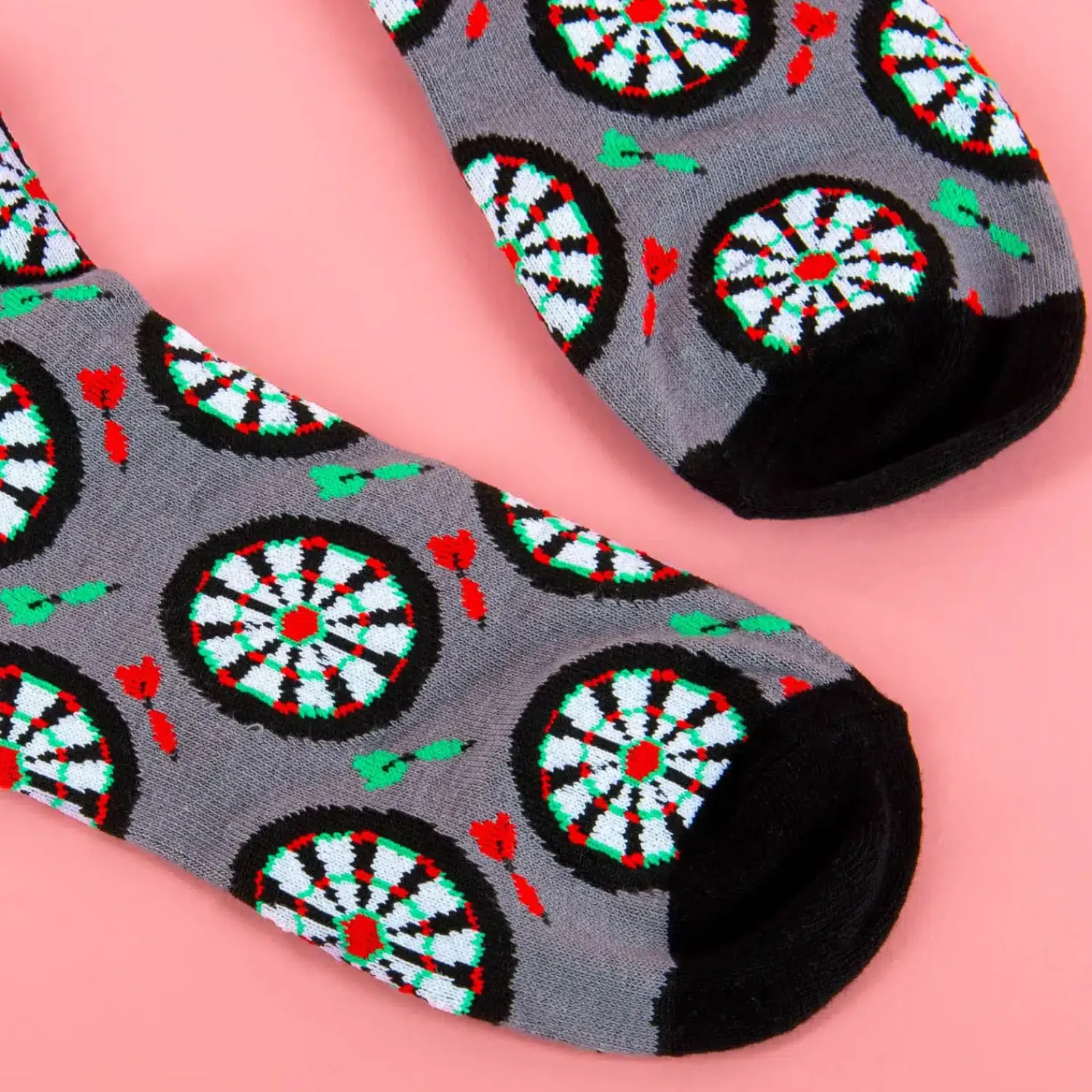 Is darten jouw favoriete sport? Of je het nou graag kijkt op televisie, zelf doet met vrienden in het café of allebei: met deze Dart sokken ben je helemaal in stijl. De grijze sokken zijn versierd met dartboards en dartpijlen en helpen je ongetwijfeld om beter te gooien. Ook leuk als cadeautje voor die vriend of je vader die dol is op darten.
