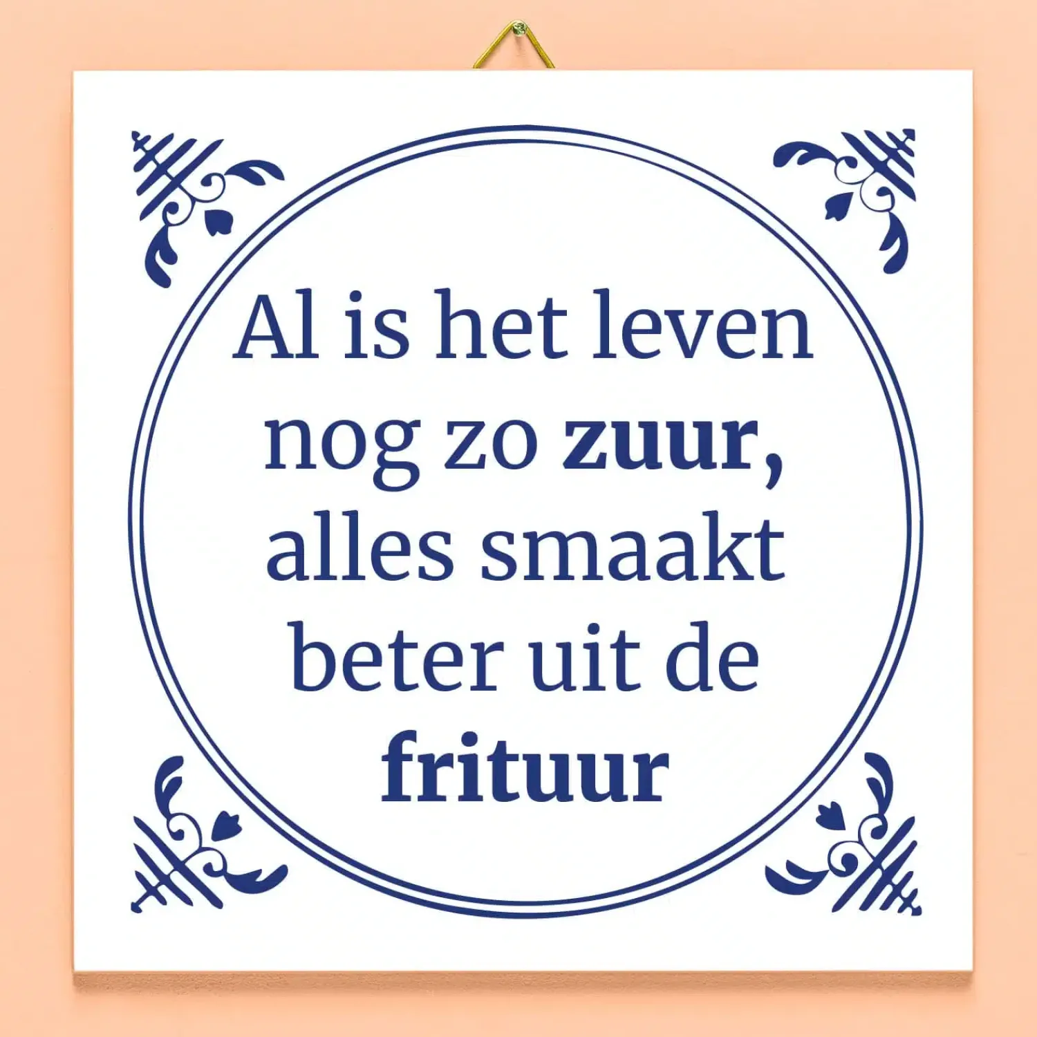 Geen AirFryer voor jou: jij kookt je dagelijkse kost gewoon in de frituur. Want al is het leven nog zo zuur, alles smaakt beter uit de frituur. En dat is precies het motto van ons Tegeltje Al is het leven nog zo zuur.