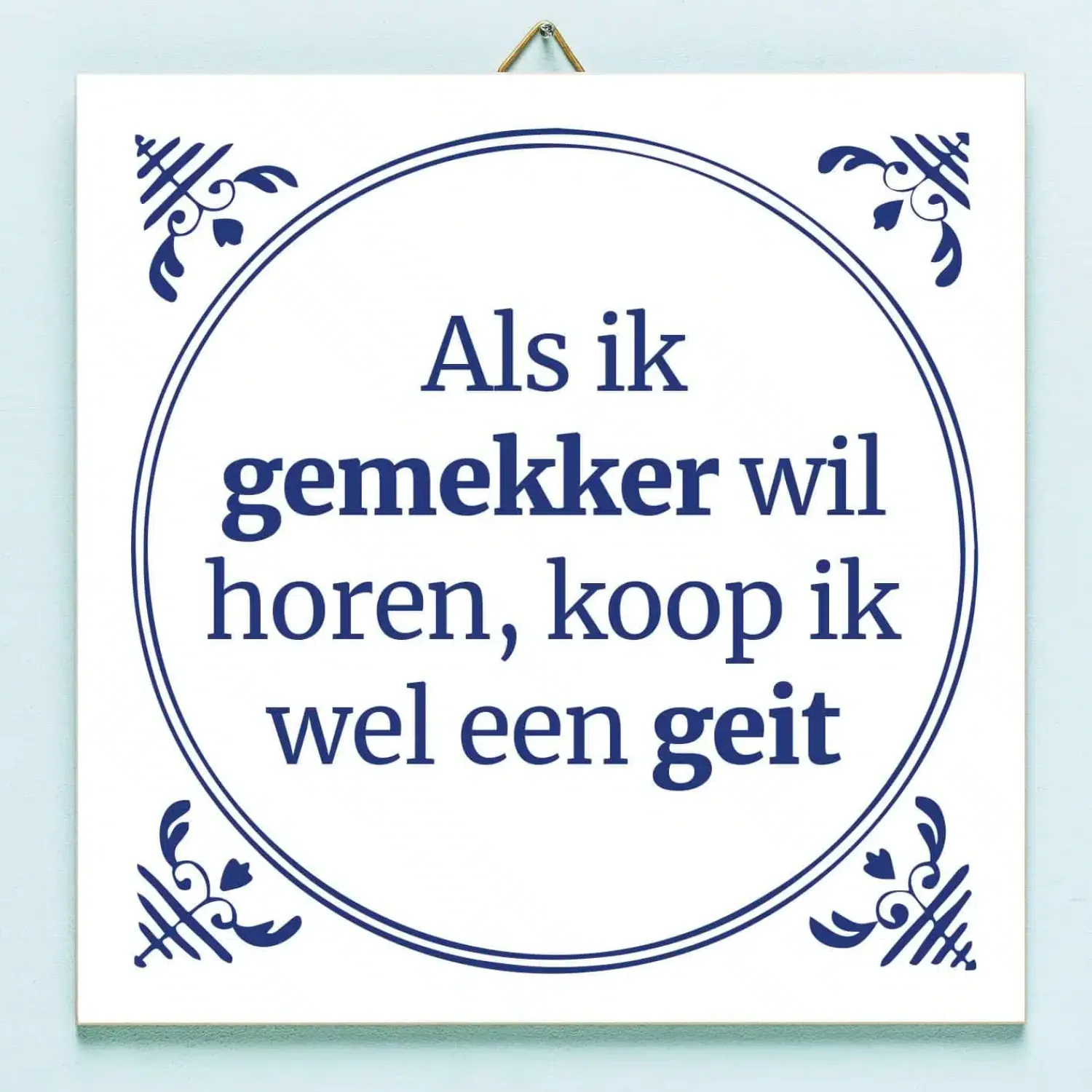 De beste manier om gemekker te horen? Een geit kopen natuurlijk. Vergeet samenwonen of trouwen: een geit mekkert al meer dan genoeg. Het Tegeltje Als ik gemekker wil horen… is een grappige manier om iedereen te laten weten hoe jij over zeurende partners denkt. Op het tegeltje staat de tekst: Als ik gemekker wil horen, koop ik wel een geit.