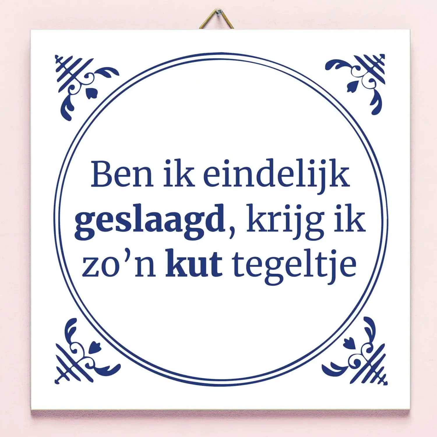 - Met de tekst: Ben ik eindelijk geslaagd, krijg ik zo’n kut tegeltje