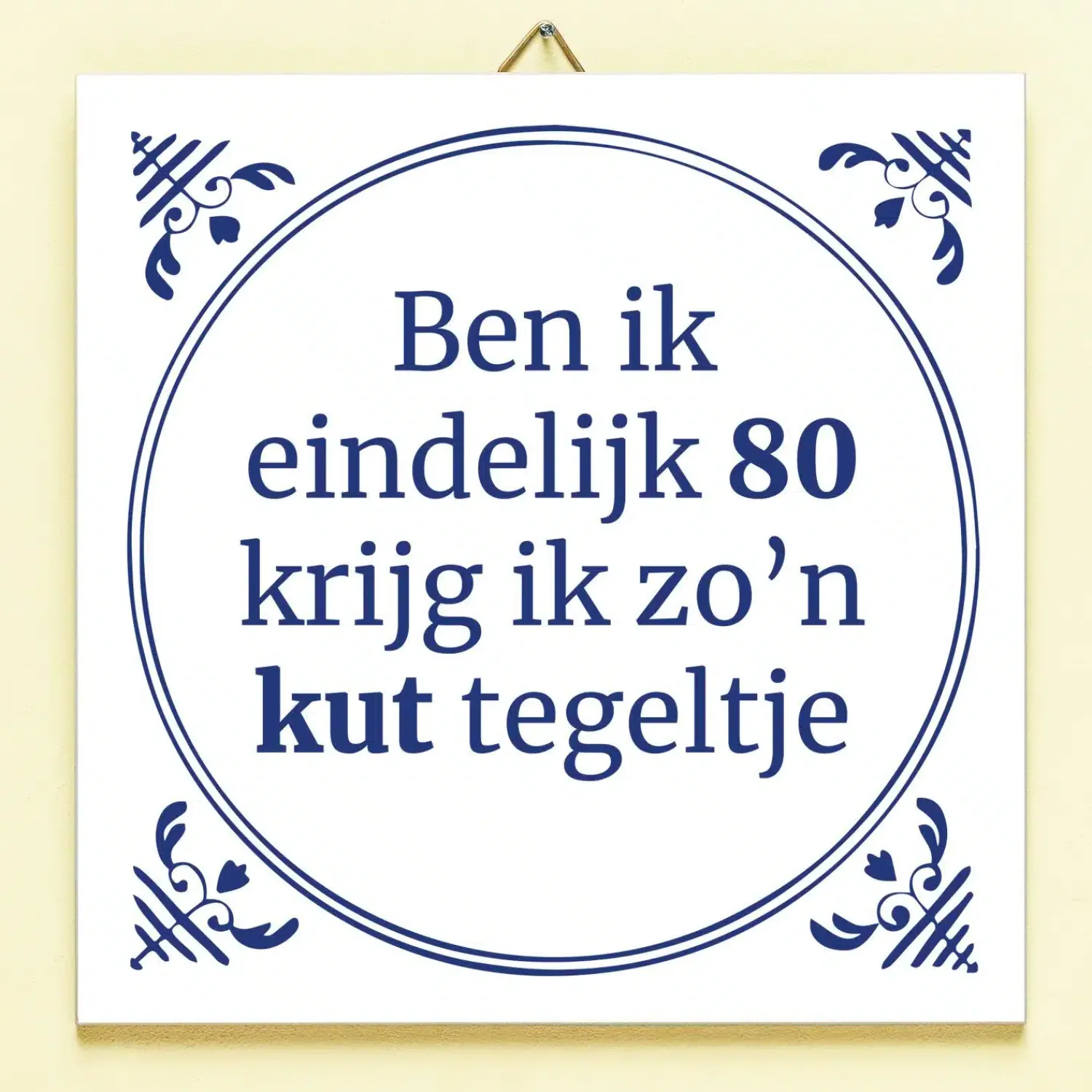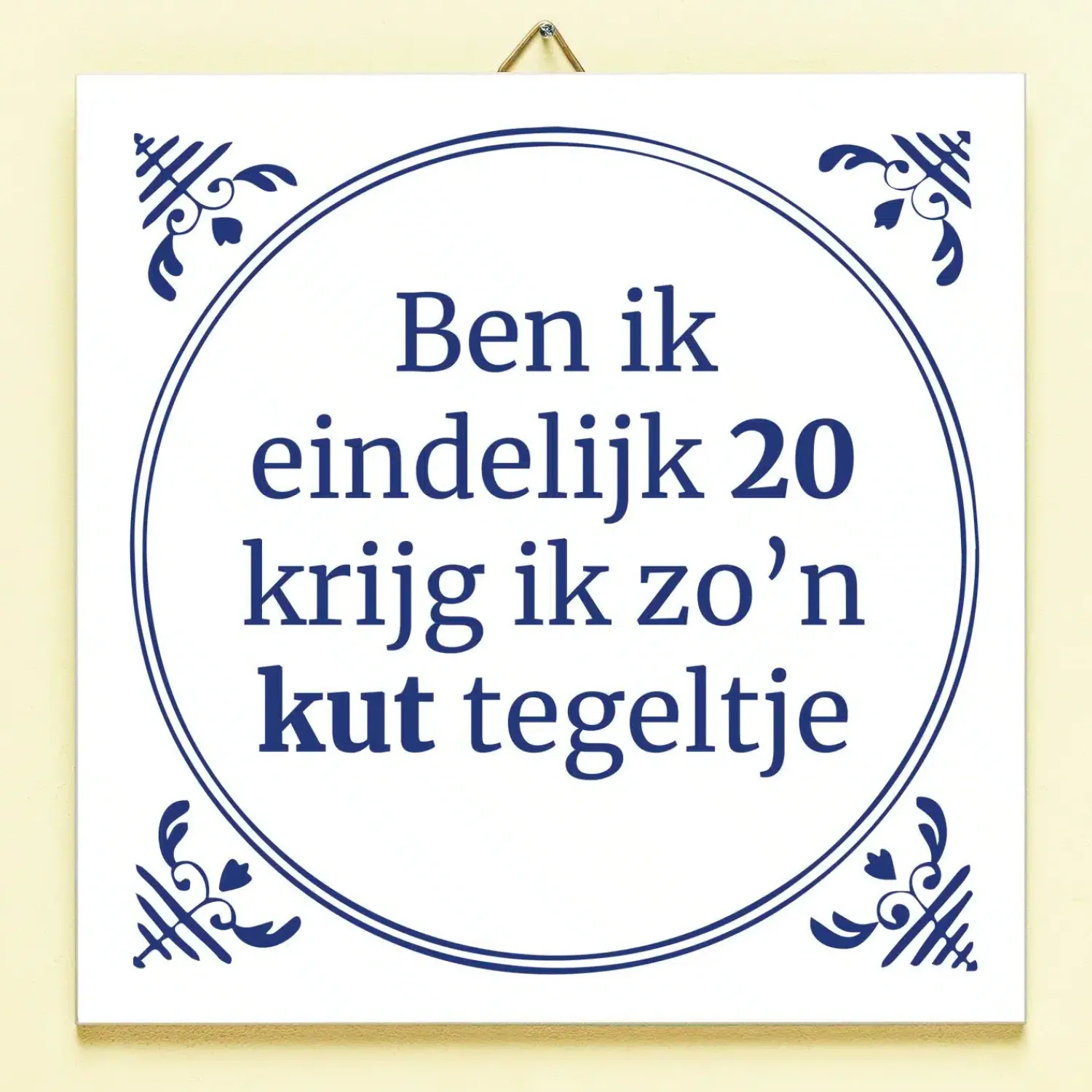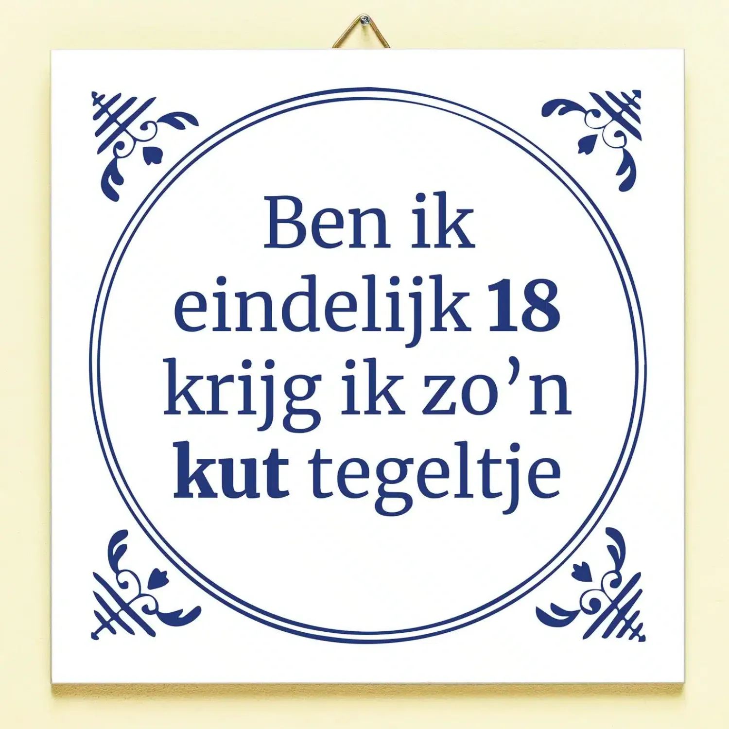 Je hebt maanden naar je verjaardag uitgekeken: een mijlpaal dit jaar nog wel. Vol spanning pak je je cadeautje uit en is het… zo’n kut tegeltje. Plaag de jarige door hem of haar het Tegeltje Ben ik eindelijk jarig te geven. Het keramische tegeltje heeft een Delfts blauw design en de tekst: Ben ik eindelijk (leeftijd), krijg ik zo’n kut tegeltje. Deze grappige tegel is leverbaar in verschillende leeftijden en komt met een tegelhaakje, zodat hij ook opgehangen kan worden.