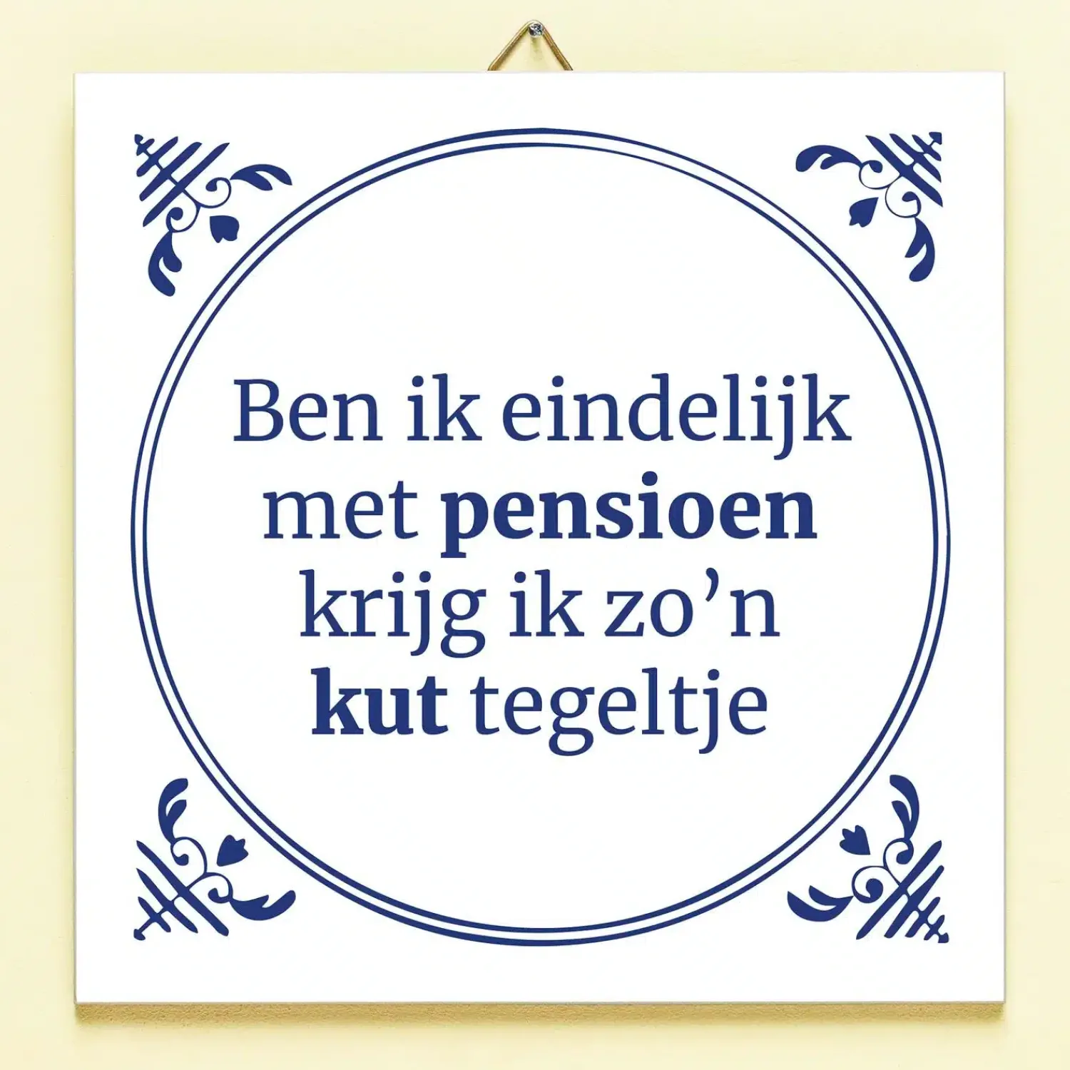 - Met de tekst: Ben ik eindelijk met pensioen, krijg ik zo’n kut tegeltje