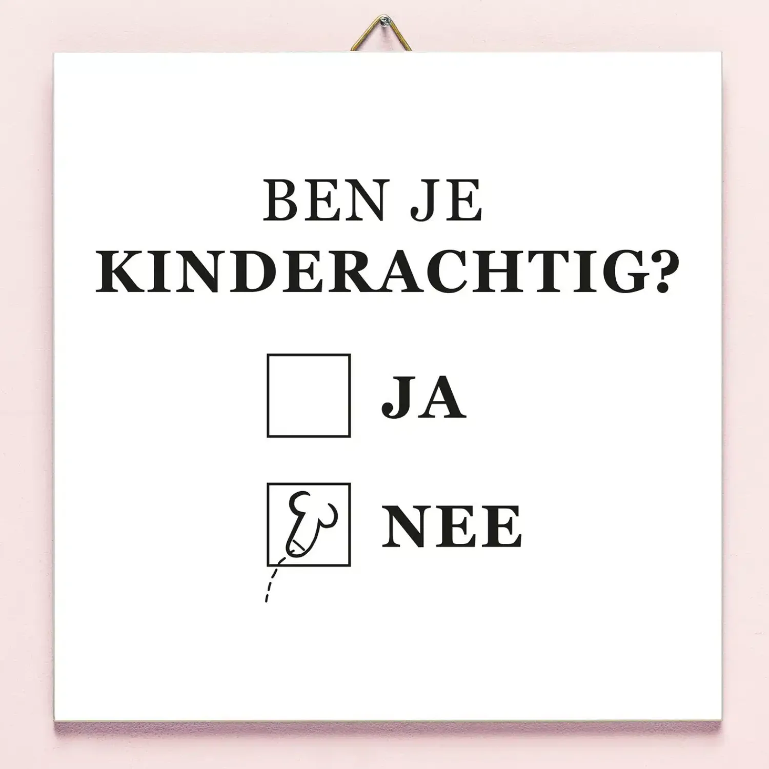 Jij kinderachtig? Echt niet! Je beste vriend daarentegen, die kan er wat van. En hij kan het Tegeltje Ben je kinderachtig daarom ook goed waarderen. Dit grappige tegeltje stelt de vraag: Ben je kinderachtig? In het nee-vakje is een plassende piemel getekend.