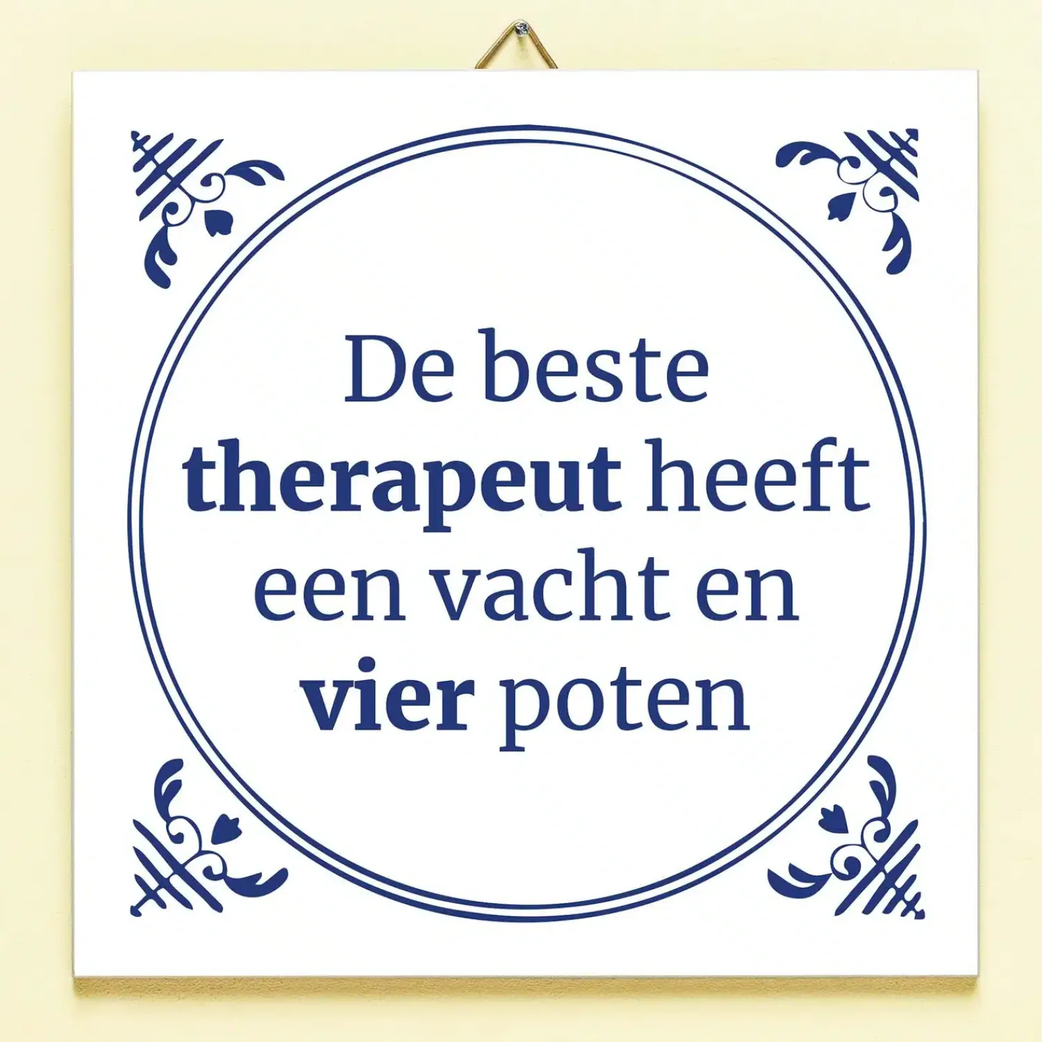 Het is echt waar: een hond aaien vermindert stress. Maar dat wist jij natuurlijk allang. Het Tegeltje De beste therapeut is een ode aan alle dieren met een vacht en vier poten. Op de op Delfts blauw geïnspireerde tegel staat de tekst: De beste therapeut heeft een vacht en vier poten. Leuk voor bij de dierenarts, op de kinderboerderij en natuurlijk in jouw huis!