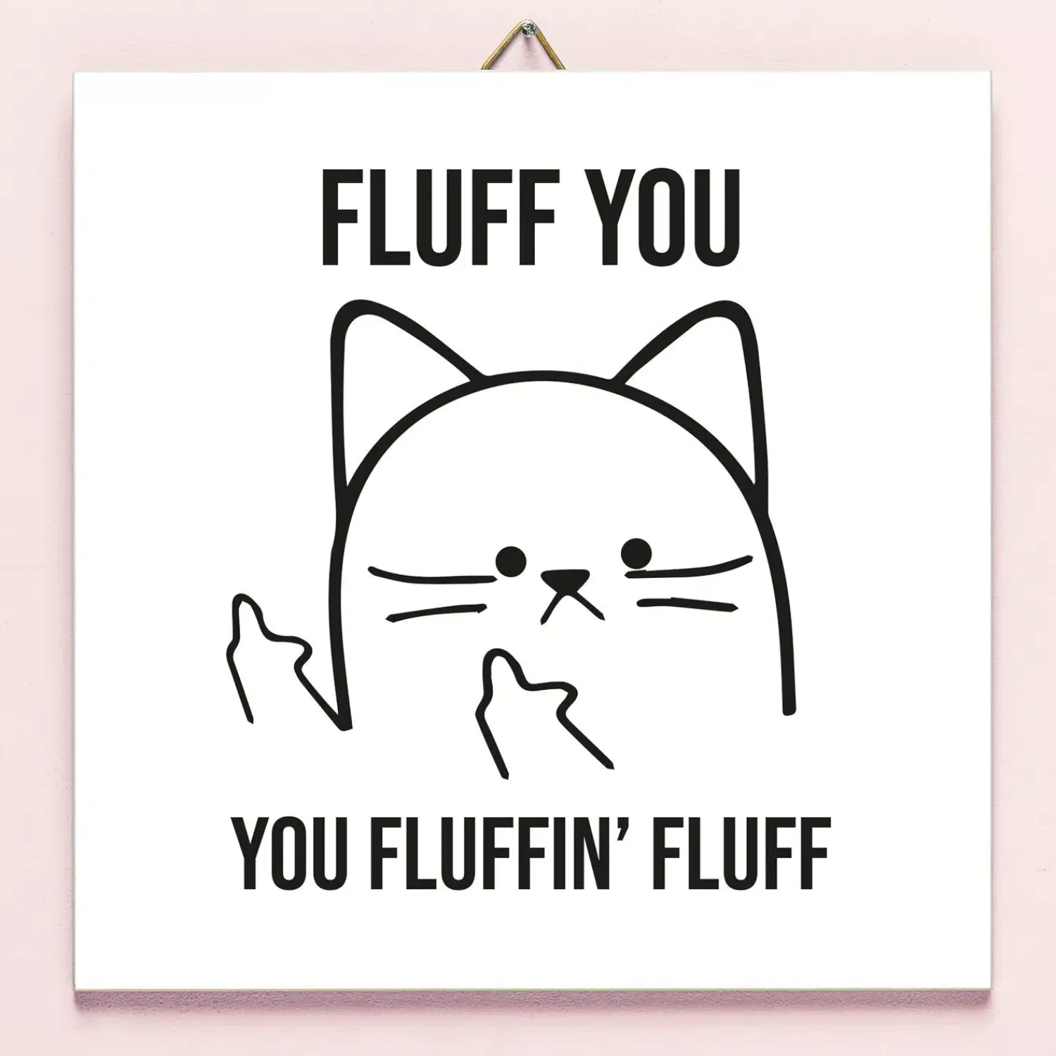 Zomaar je collega zeggen dat ‘ie op kan sodemieteren is misschien niet het beste voor je werkrelatie. Maar het Tegeltje Fluff You kun je gewoon ophangen of neerzetten op je werkplek. Op dit tegeltje staat een lichtelijk geïrriteerde kat en de tekst: Fluff You You Fluffin’ Fluff.