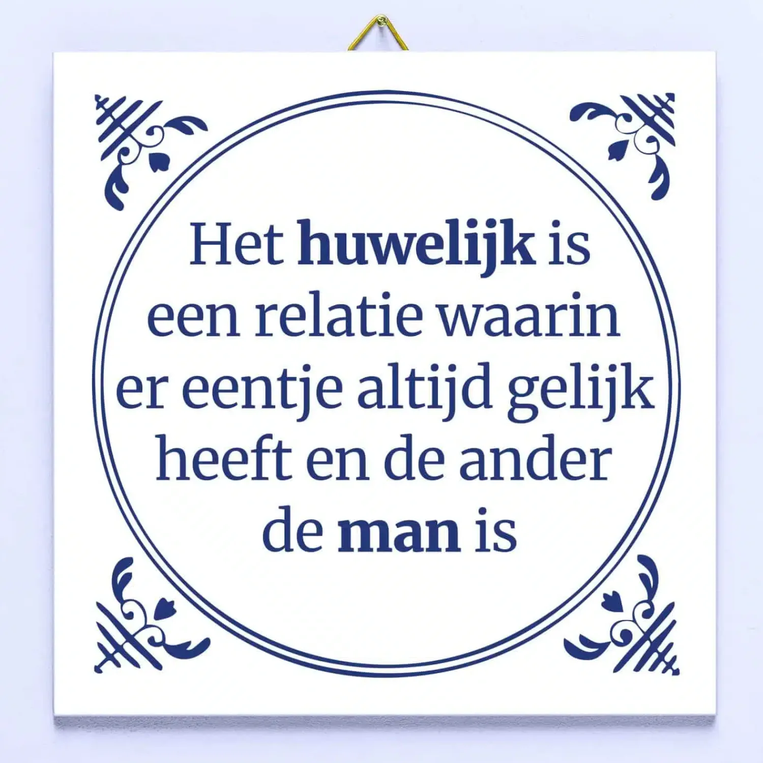 Heb je een stel vrienden die binnenkort gaan trouwen? Verras ze met het grappige Tegeltje Het huwelijk is een relatie… Op dit op Delfts blauw geïnspireerde tegeltje staat de tekst: Het huwelijk is een relatie waarin er eentje altijd gelijk heeft en de ander de man is. Zo weten ze alvast wat ze kunnen verwachten in de toekomst. Ook grappig om als plagerijtje aan je partner te geven.