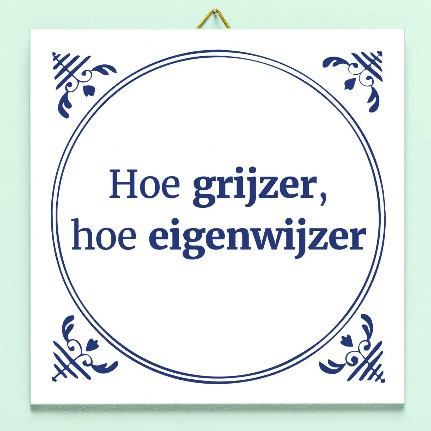 We kennen ze allemaal: (schoon)ouders die met het jaar eigenwijzer worden. Ze zeggen niet voor niets: hoe grijzer, hoe eigenwijzer. En dat is precies de tekst die op het Tegeltje Hoe grijzer, hoe eigenwijzer staat. Een lollig cadeau voor iemand die al ouder is, maar ook om te geven aan een vriend of vriendin die net de eerste grijze haar heeft ontdekt.