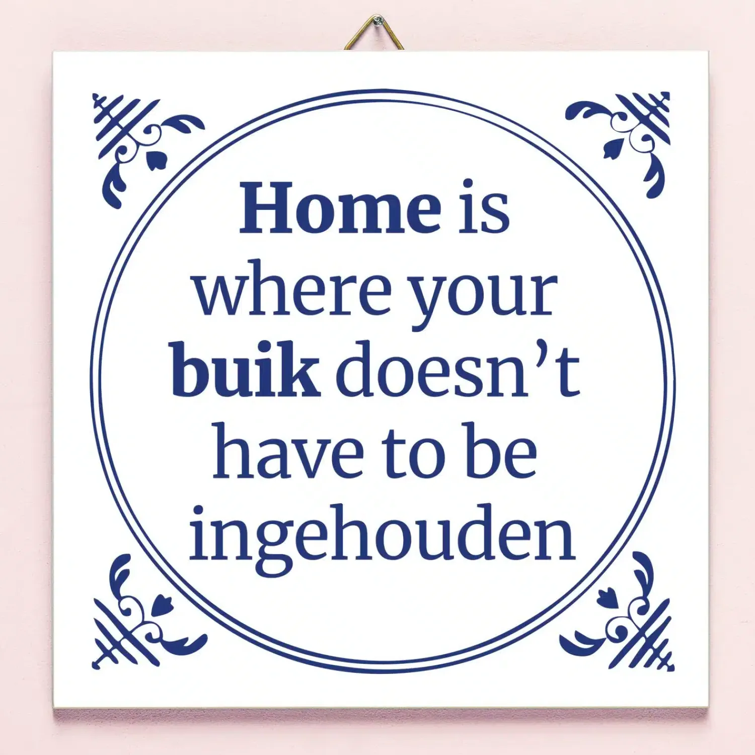 Je eigen meubels, een gezellig kleurtje op de muur, foto’s aan de wand: wat zorgt ervoor dat jouw huis aanvoelt als thuis? Volgens het Tegeltje Home is where your buik doesn’t have to be ingehouden is het duidelijk. Thuis is waar je je buik niet hoeft in te houden. Geef dit op Delfts blauw geïnspireerde tegeltje bijvoorbeeld cadeau voor een housewarming, dan maak je zeker indruk.