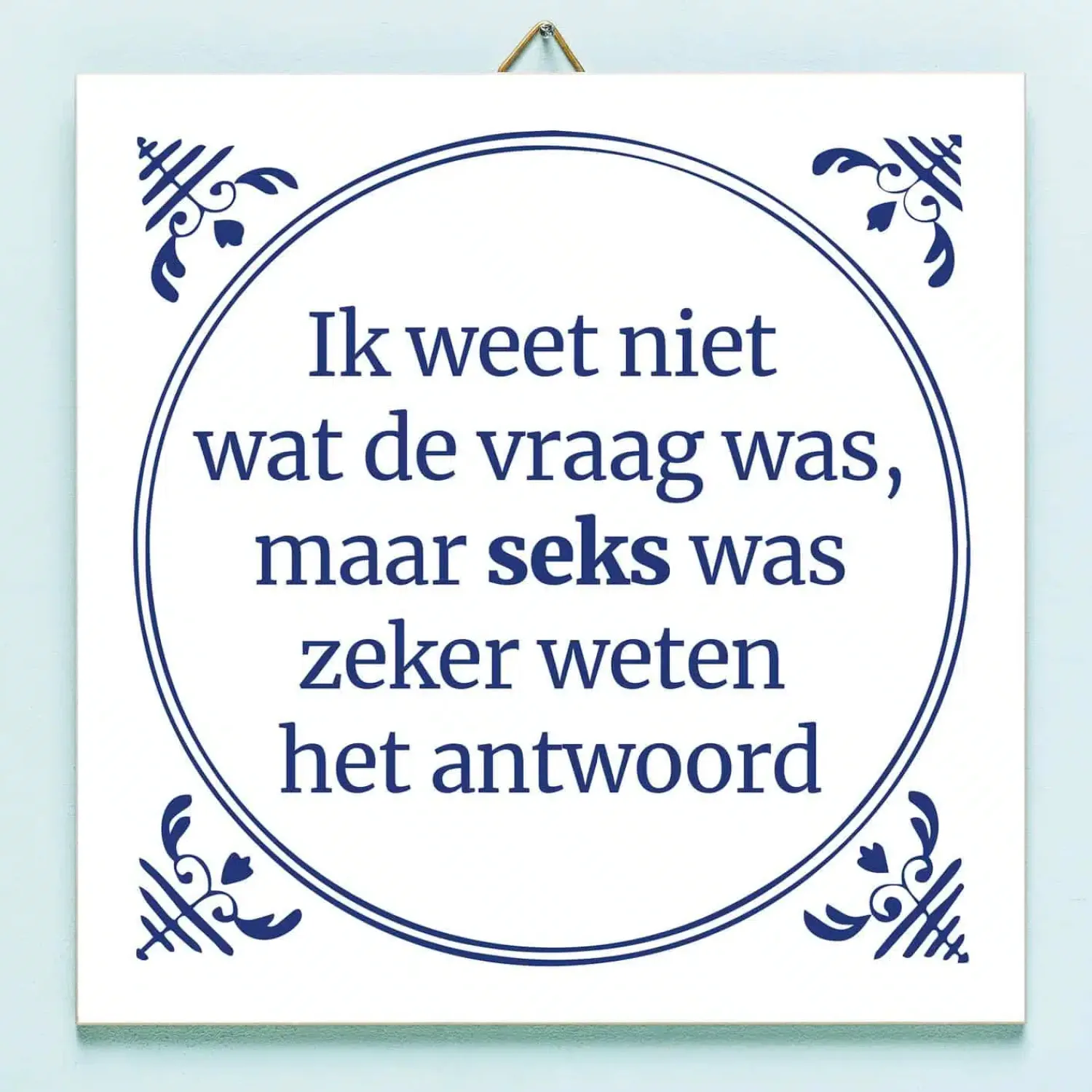 Geef maar toe: toen jij de tekst op het Tegeltje Ik weet niet wat de vraag was las, toen moest je direct aan iemand denken. Zo iemand die denkt dat seks het antwoord op alles is. Op het op Delfts blauw geïnspireerde tegeltje staat de tekst: Ik weet niet wat de vraag was, maar seks was zeker weten het antwoord.