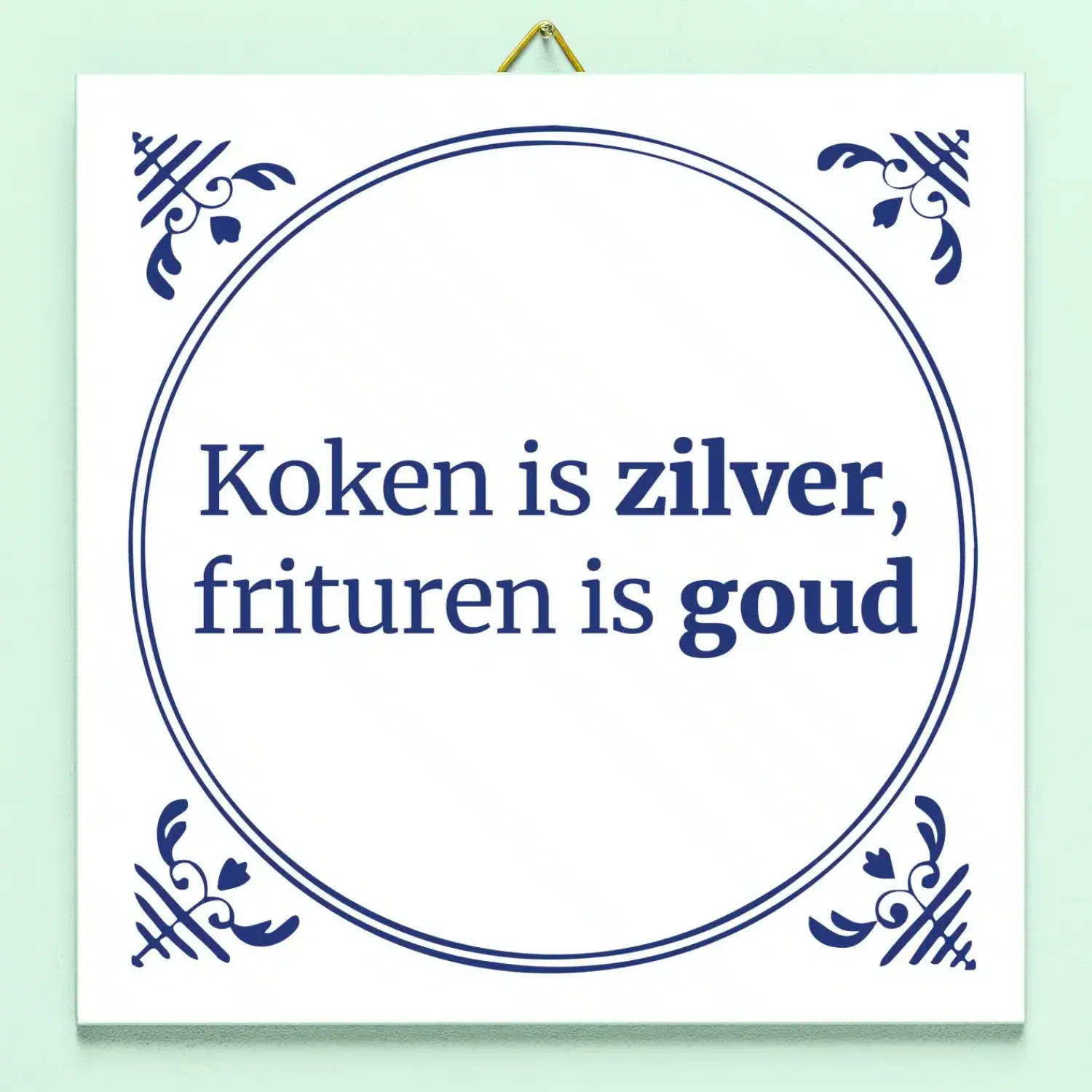 Niks geen Airfryer: jij frituurt elke dag. Want gezond eten is leuk en zelf koken is vast goed voor je, maar er kan niks op tegen frituren. Voor echte frituurfans koop je het Tegeltje Koken is zilver. Op dit op Delfts blauw geïnspireerde tegeltje staat de tekst: Koken is zilver, frituren is goud. Hang ‘m in je frituurschuur of gewoon in de keuken.