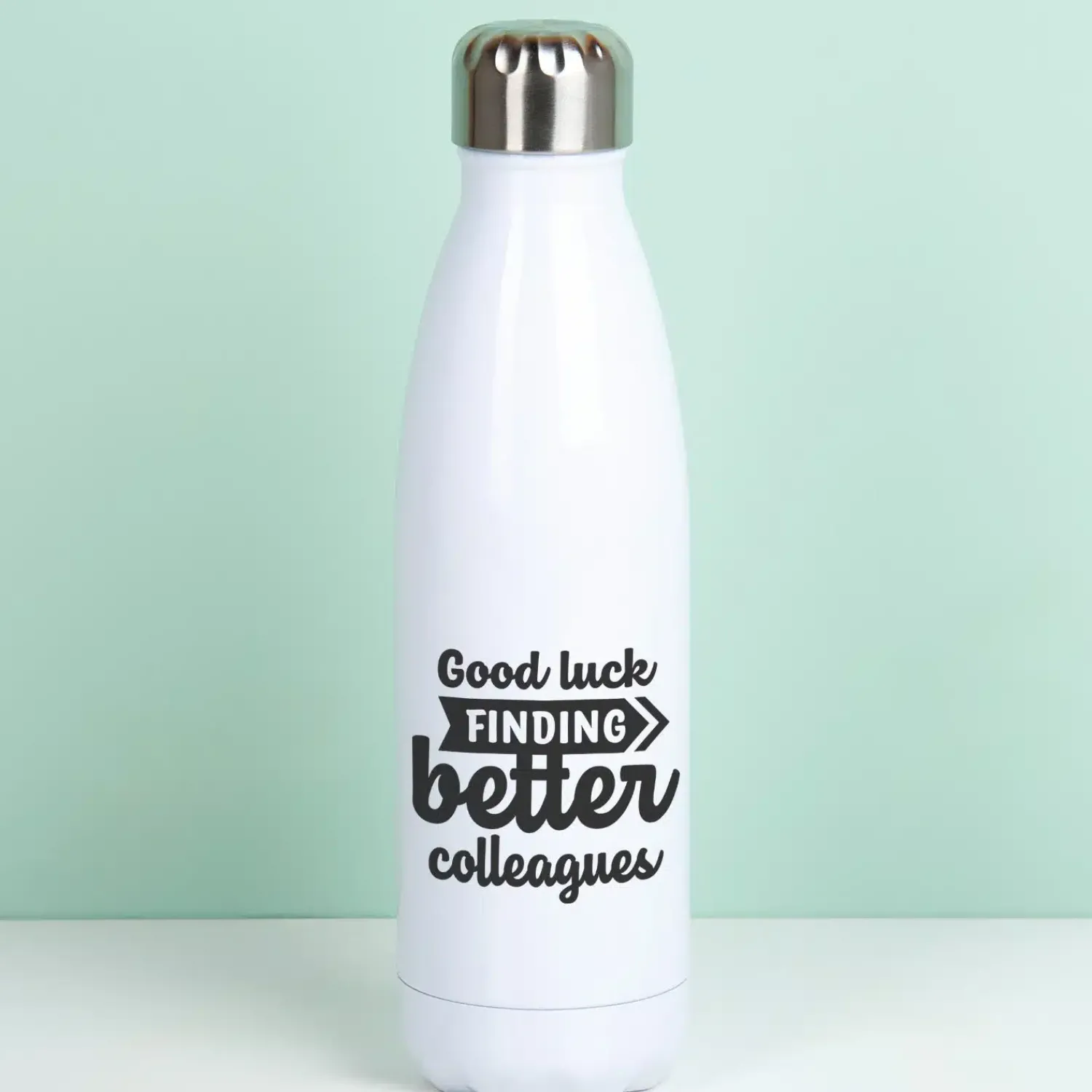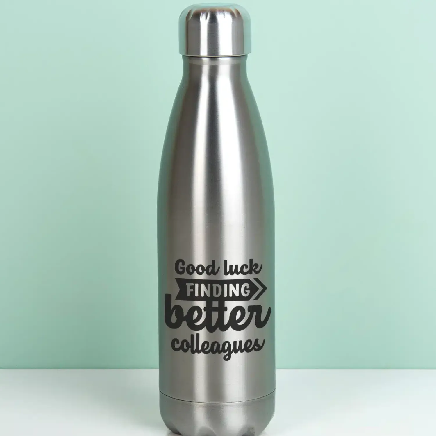Het is altijd balen als je favoriete collega een nieuwe baan heeft en je niet meer samen de werkvloer onveilig kunt maken. Daarom verdient hij of zij een afscheidscadeau om aan je te blijven denken. De Thermosfles Better Colleagues is een fles die daarbij zeker helpt. Op de fles staat namelijk de grappige tekst: Good luck finding better colleagues.