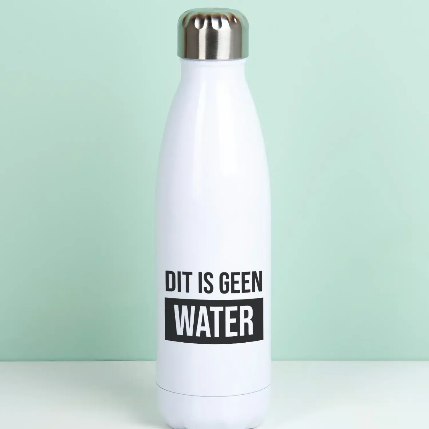 - Duurzame thermosfles met de tekst: Dit is geen water