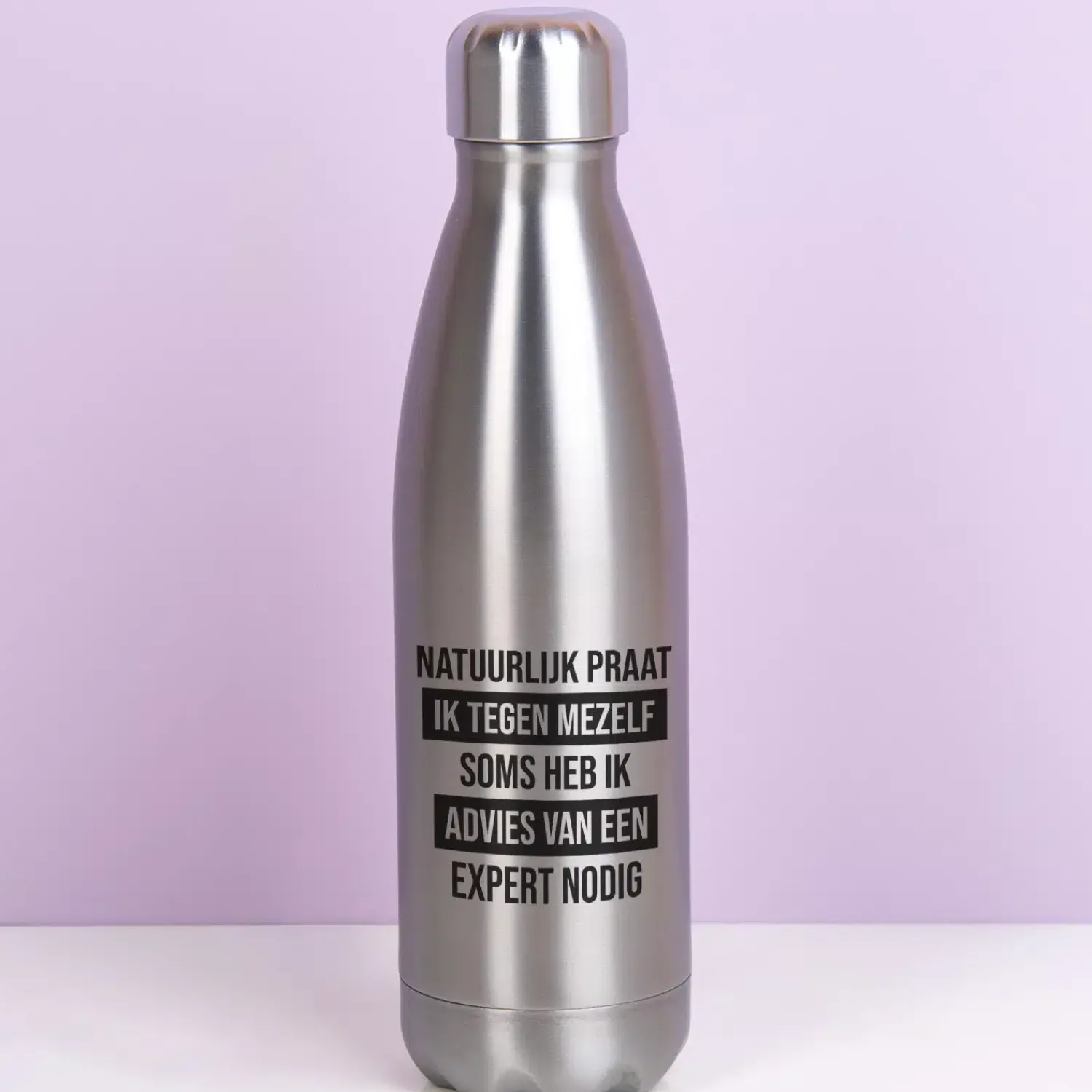 Tegen jezelf praten gek? Niet als je echt goed advies nodig hebt! De Thermosfles Natuurlijk praat ik tegen mezelf legt precies uit waarom je tegen jezelf praat. Op de fles staat de tekst: Natuurlijk praat ik tegen mezelf. Soms heb ik advies van een expert nodig. Grappige thermosfles, die je ook cadeau kunt geven aan je collega die in zichzelf praat. Het is zowel een leuk als praktisch cadeau, want de thermosfles houdt dranken 12 uur warm en 24 uur koel en kan dus het hele jaar door gebruikt worden.