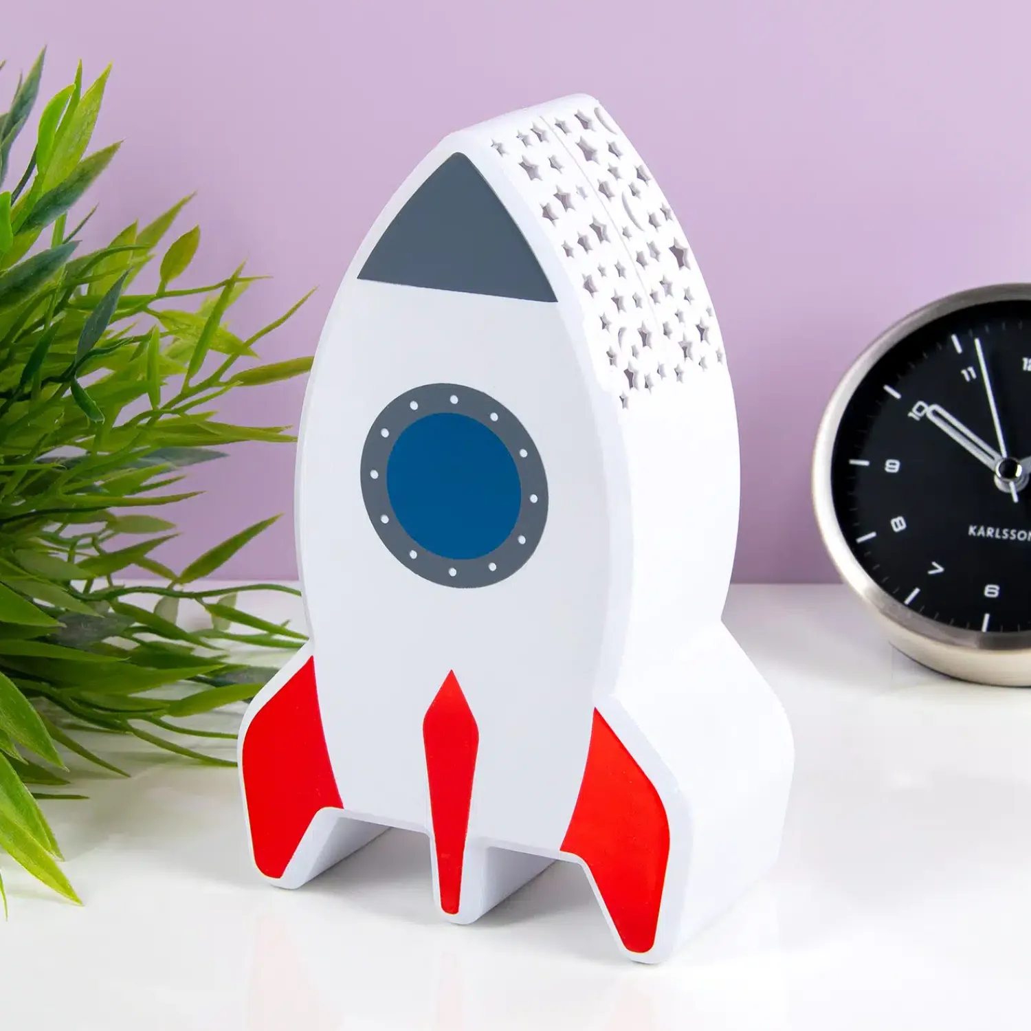 De kinderkamer is niet compleet zonder een leuk lampje, dat je ‘s avonds kunt gebruiken als nachtlampje. De Raket projector is zo’n lampje. Het ziet eruit als een stoere raket, maar is ook heel geschikt voor als je kindje liever niet gaat slapen in het donker. Aan de bovenkant van de lamp zitten open sterretjes en maantjes, waardoor het licht naar buiten schijnt. Op die manier krijg je een sterrenhemel op je plafond of muur.